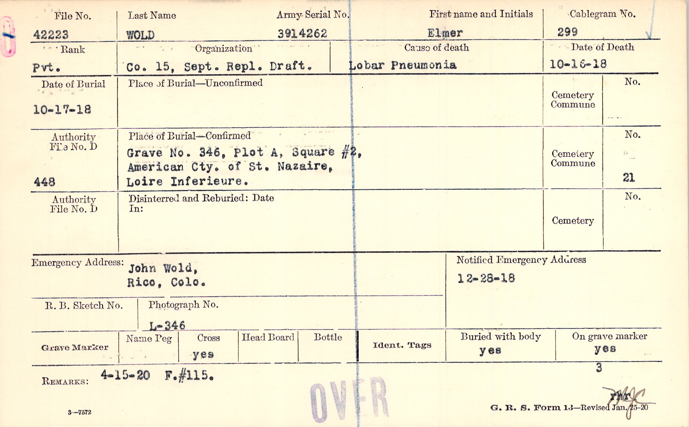 Grave 346, Plot A, Square #2, American Cty. of St Nazaire, Loire Inferieure.