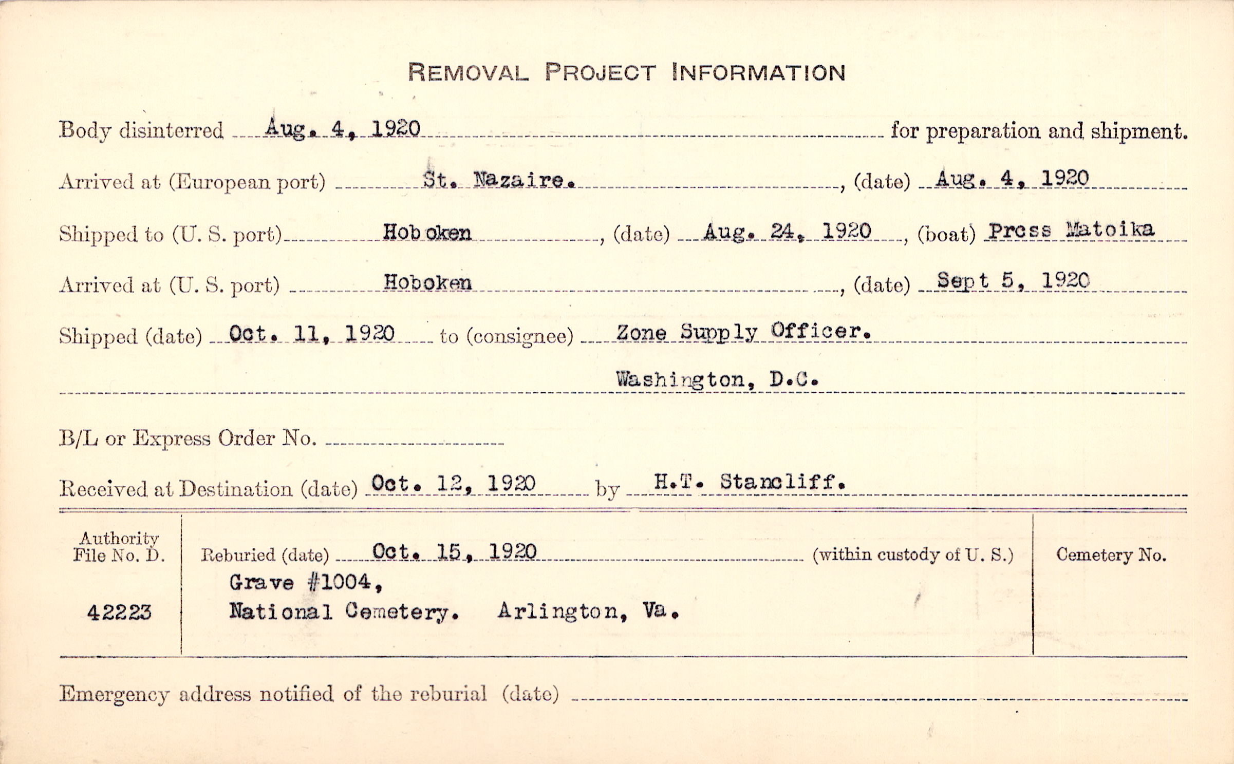 Body disinterred 8/4/1920 for preparation and shipment.