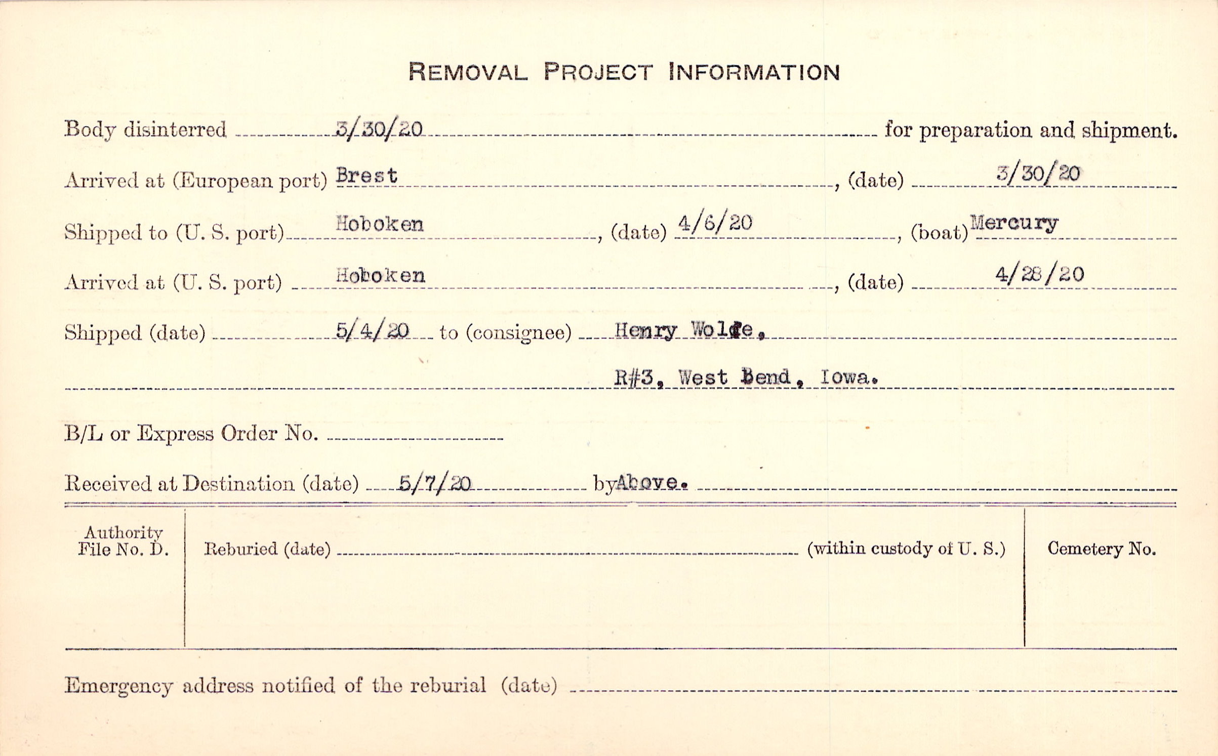 Body disinterred 3/30/1920 for preparation and shipment.