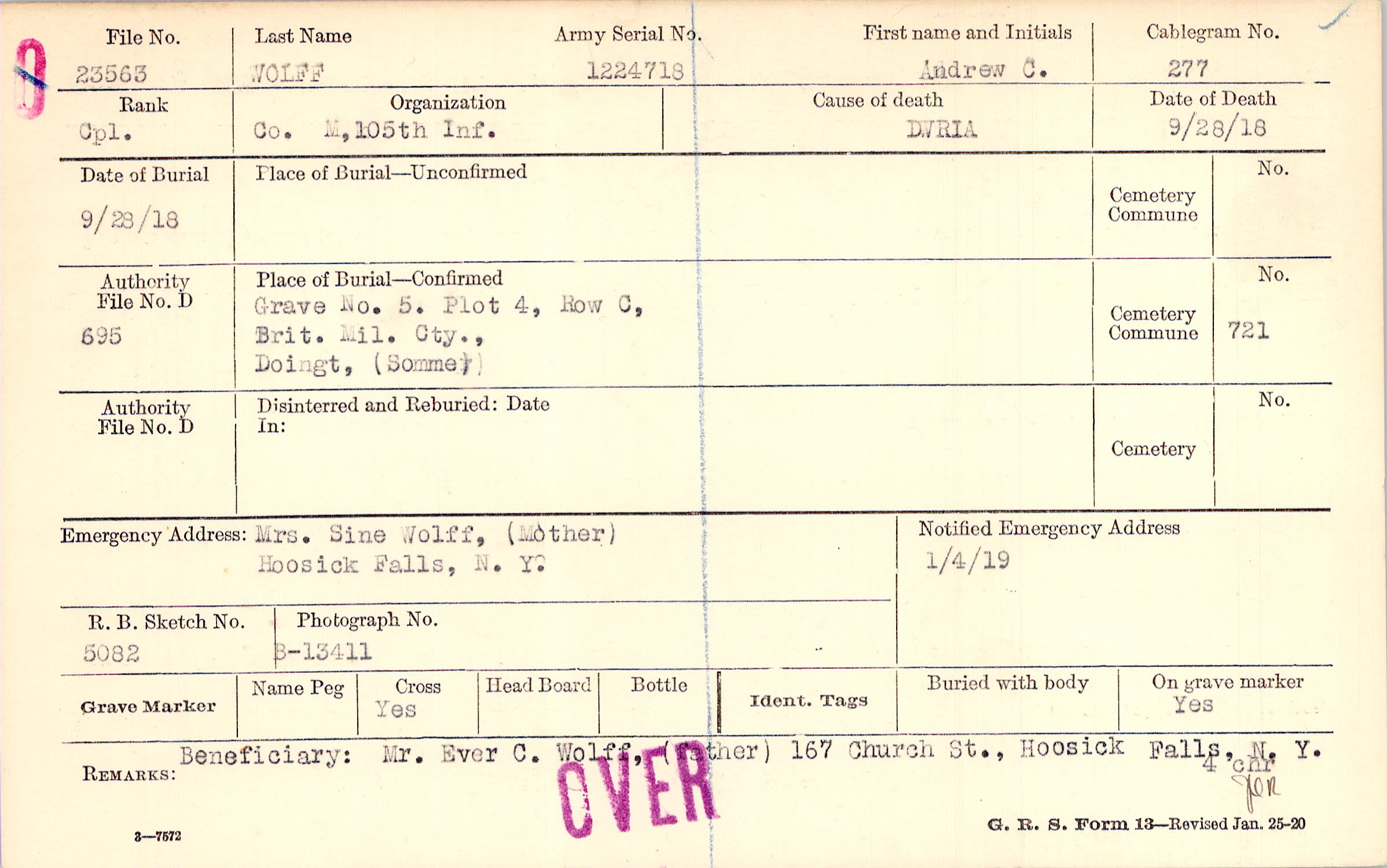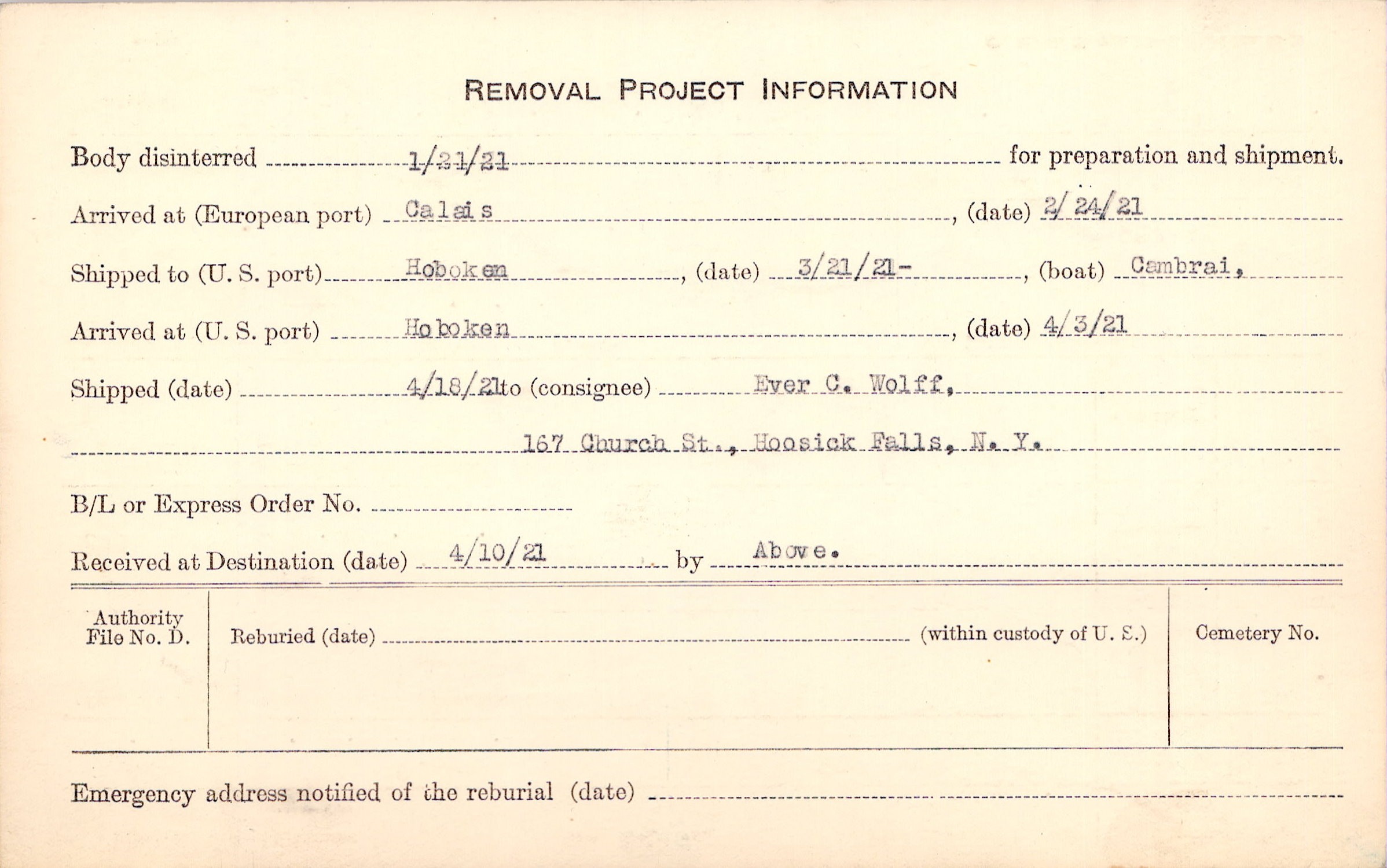 Beneficiary: Mr. Ever C. Wolff, (father) 167 Church St., Hoosick Falls, N. Y.