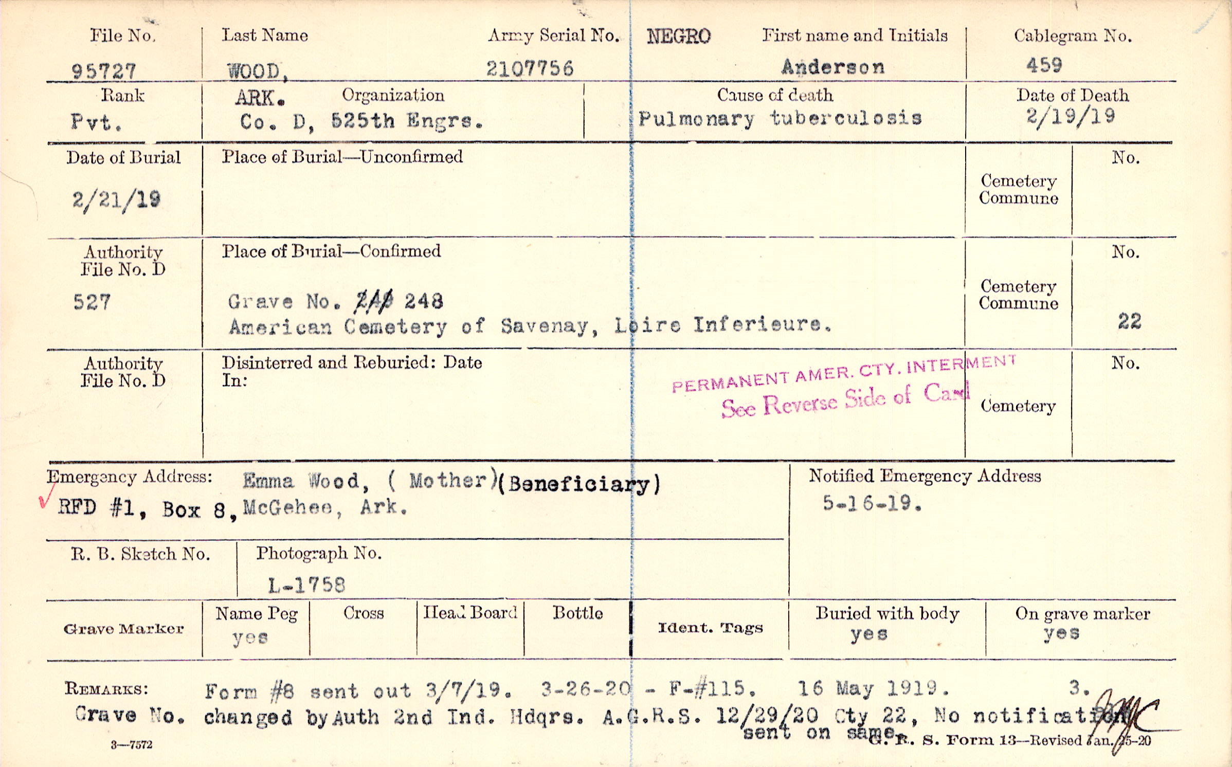Emma Wood, (Mother), RFD #1, Box 8, McGehee, Ark., (Beneficiary)