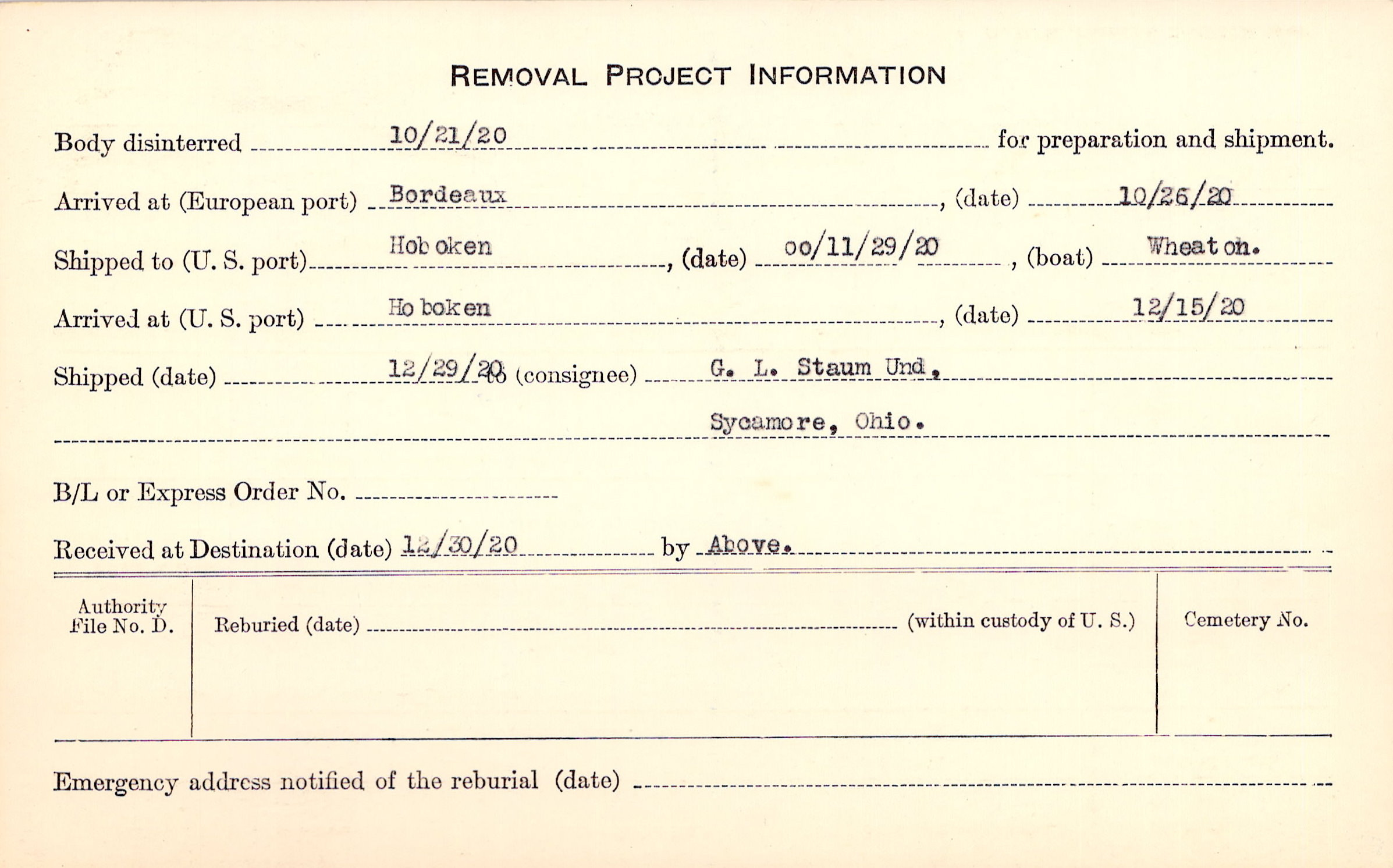 Body disinterred 10/21/1920 for preparation and shipment.