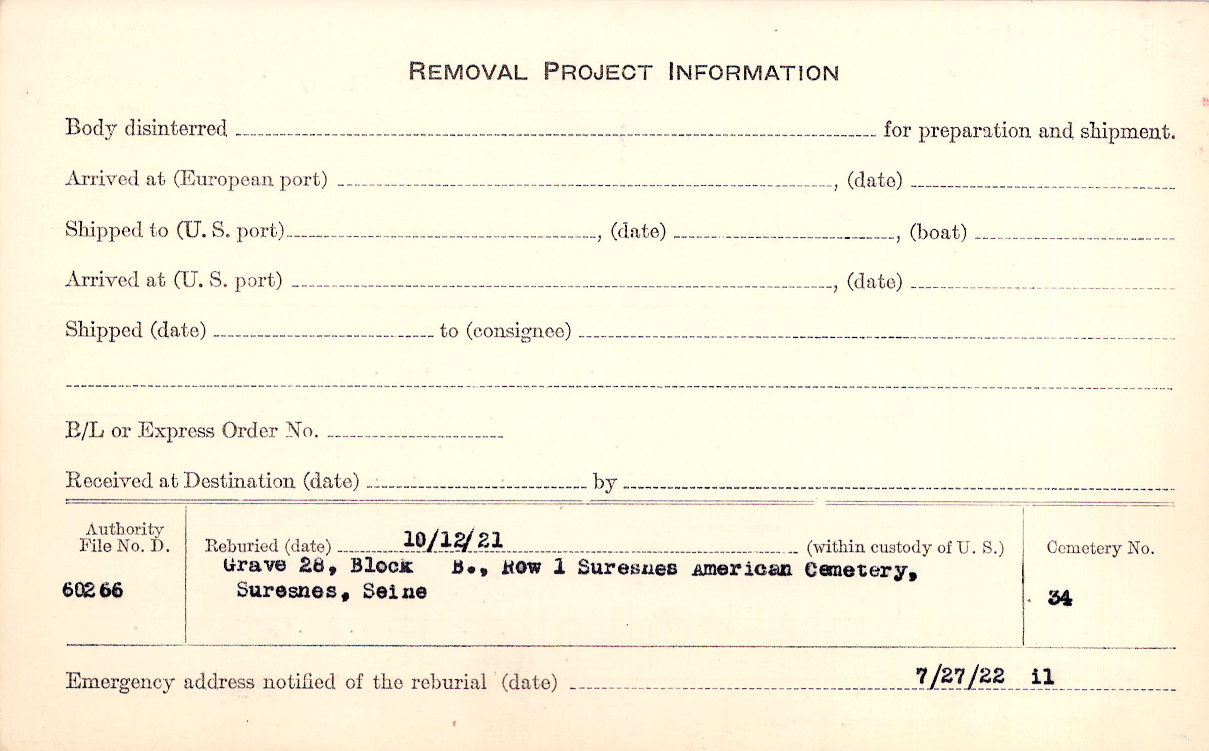 | Permanent Burial in Foreign Cemetery |