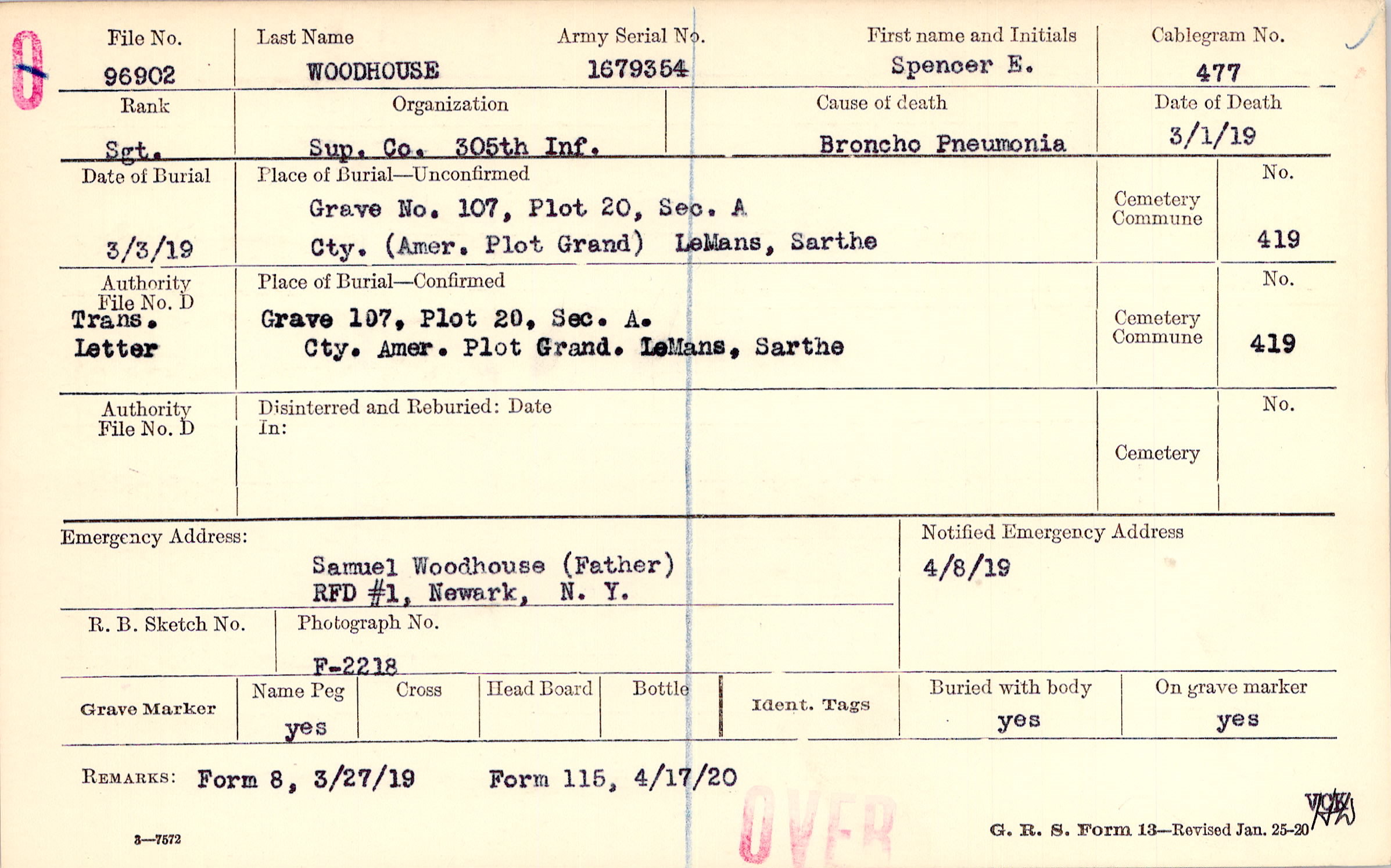 Grave 107, Plot 20, Sec. A, Cty. Amer. Plot, Grand, LeMans, Sarthe