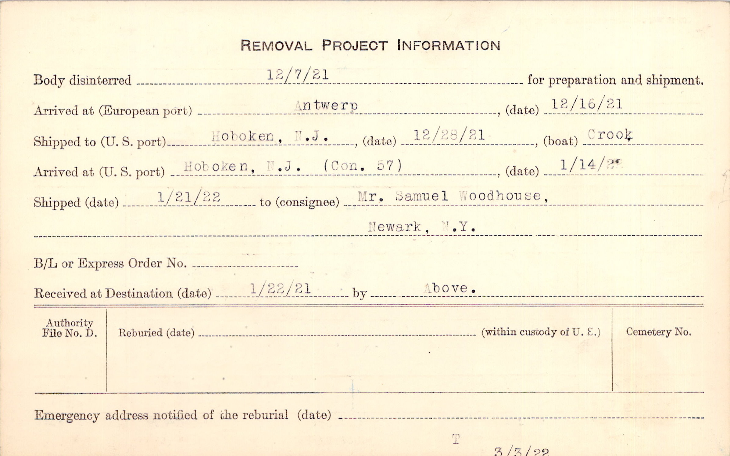 Body disinterred 12/7/1921 for preparation and shipment.
