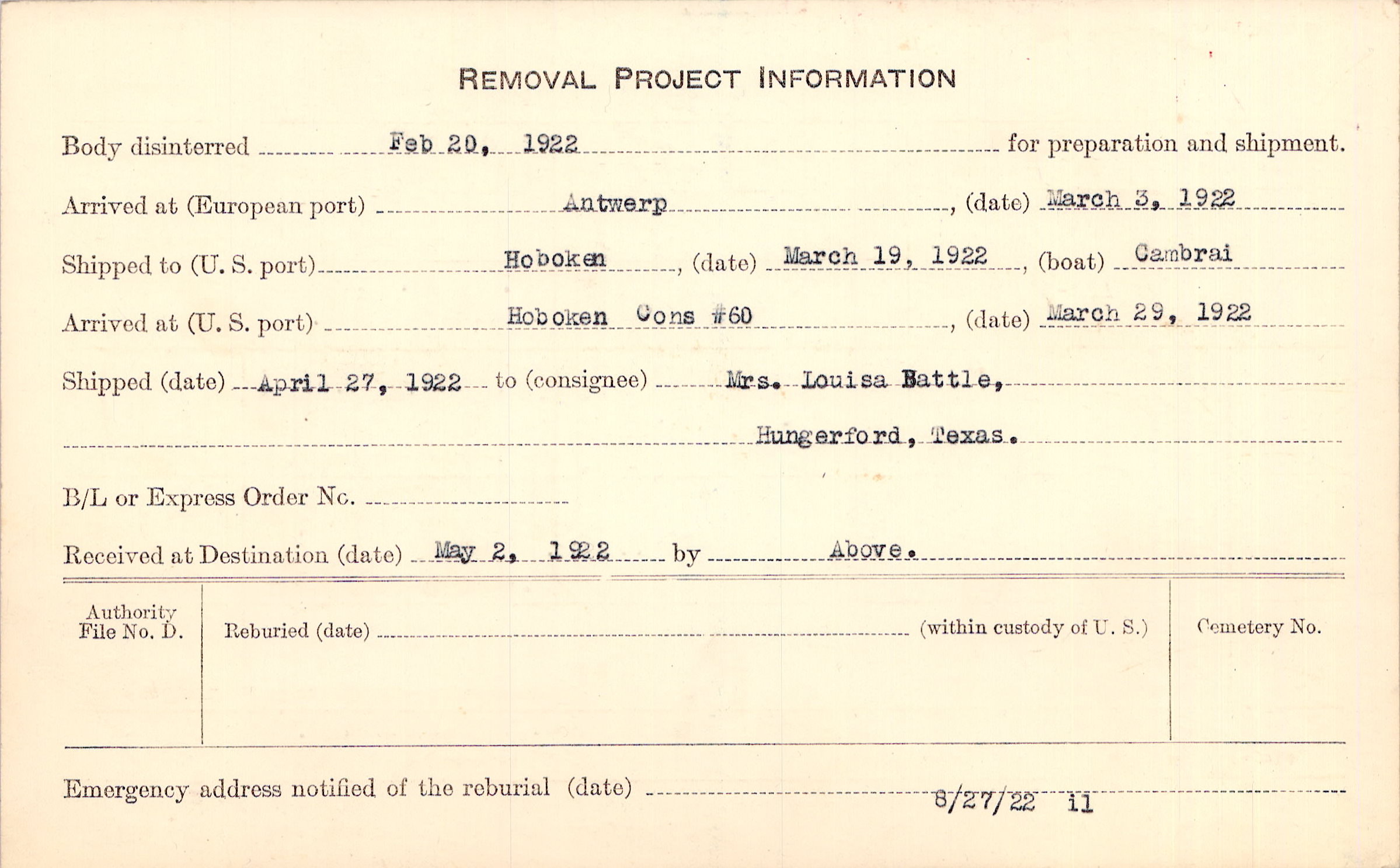 Body disinterred 2/20/1922 for preparation and shipment.
