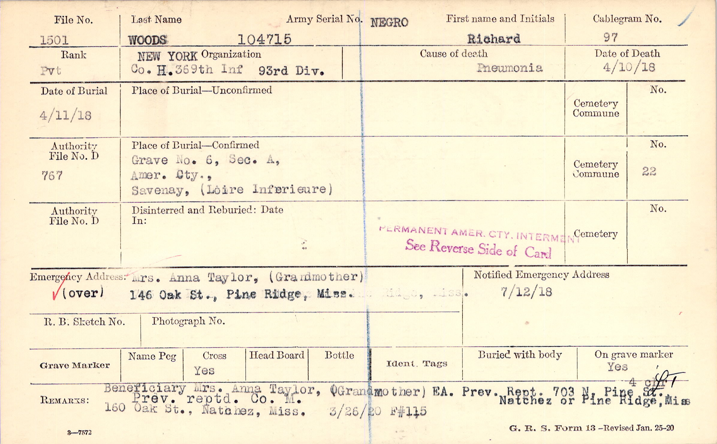 Mrs. Anna Taylor, (Grandmother), 146 Oak St., Pine Ridge, Miss., (over)