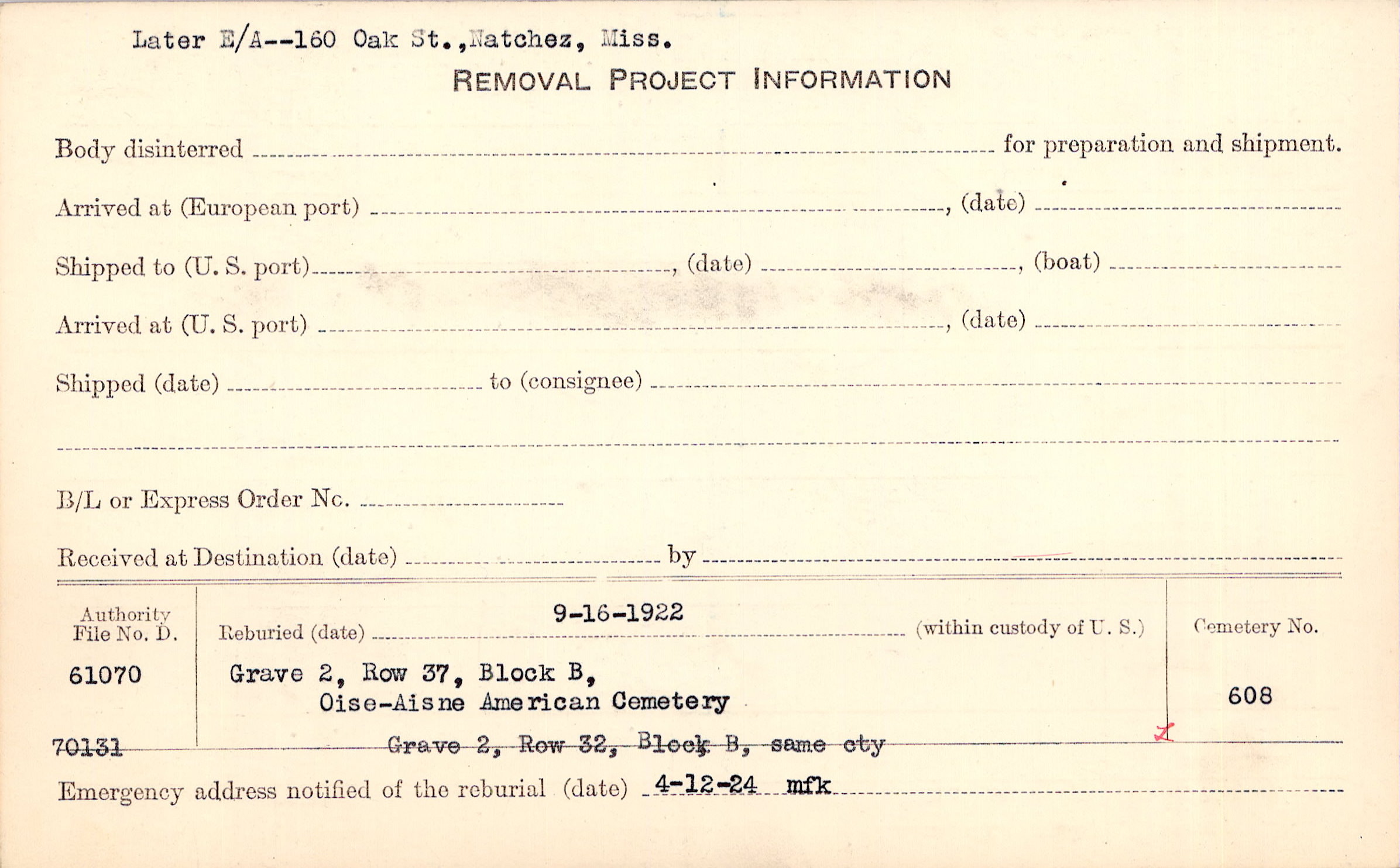 Prior Burial in Foreign Cemetery |
