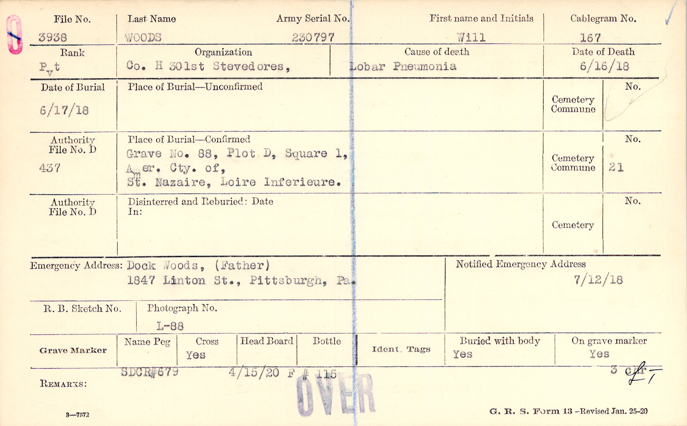 Grave 88, Plot D, Square 1, Amer. Cty. of St. Nazaire, Loire Inferieure.