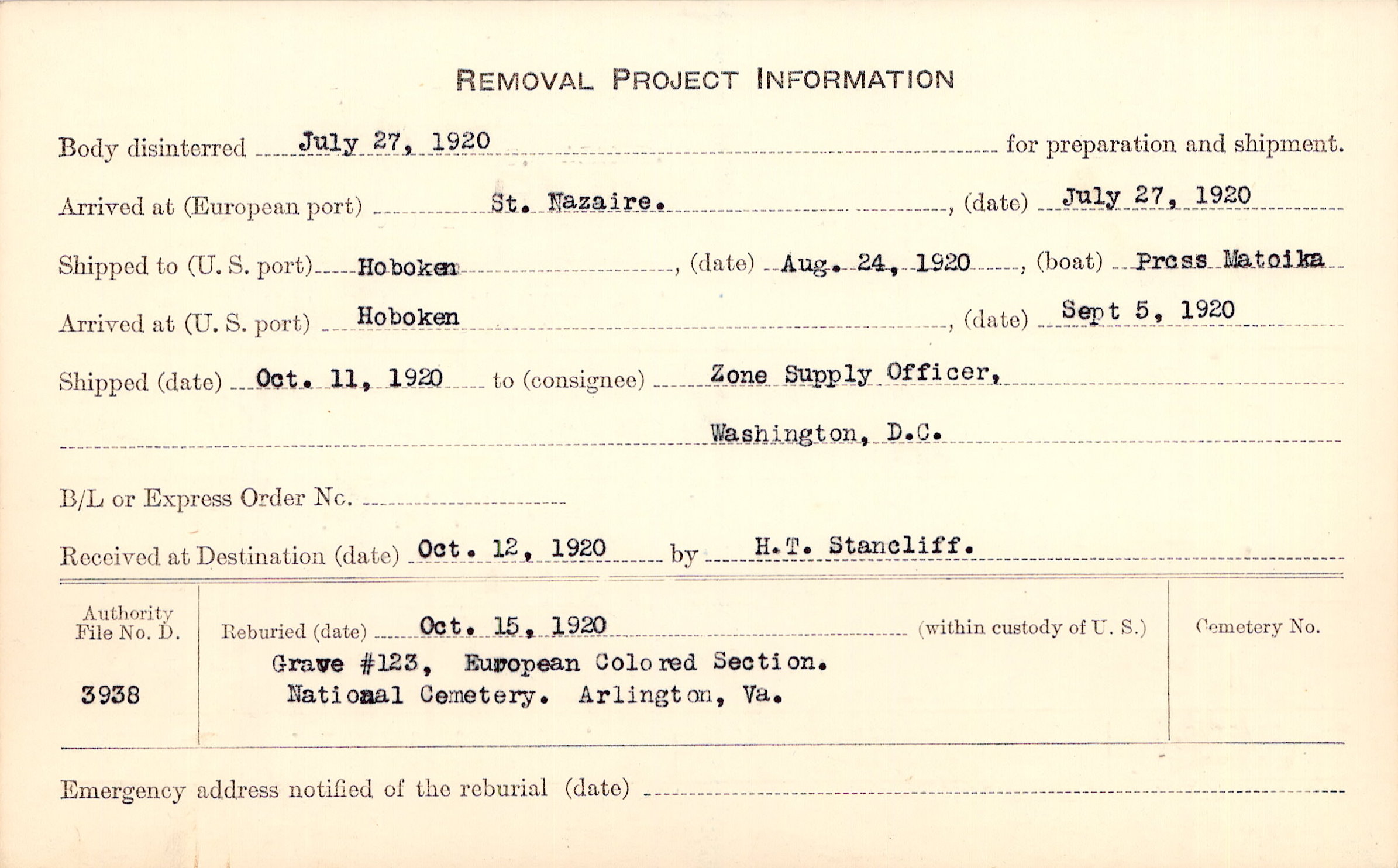 Body disinterred 7/27/1920 for preparation and shipment.