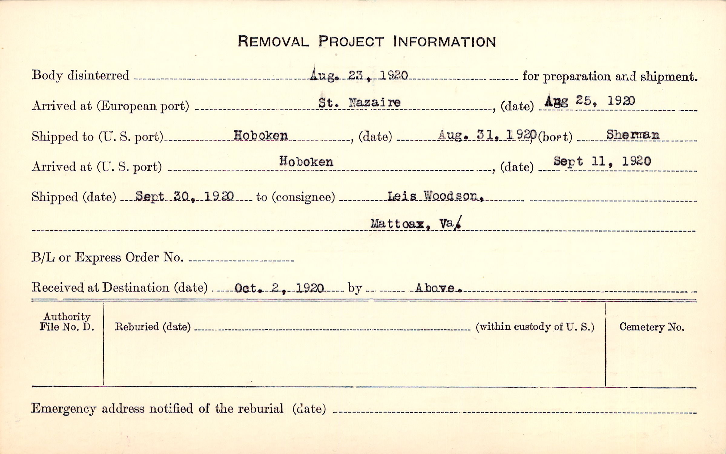 Body disinterred 8/23/1920 for preparation and shipment.