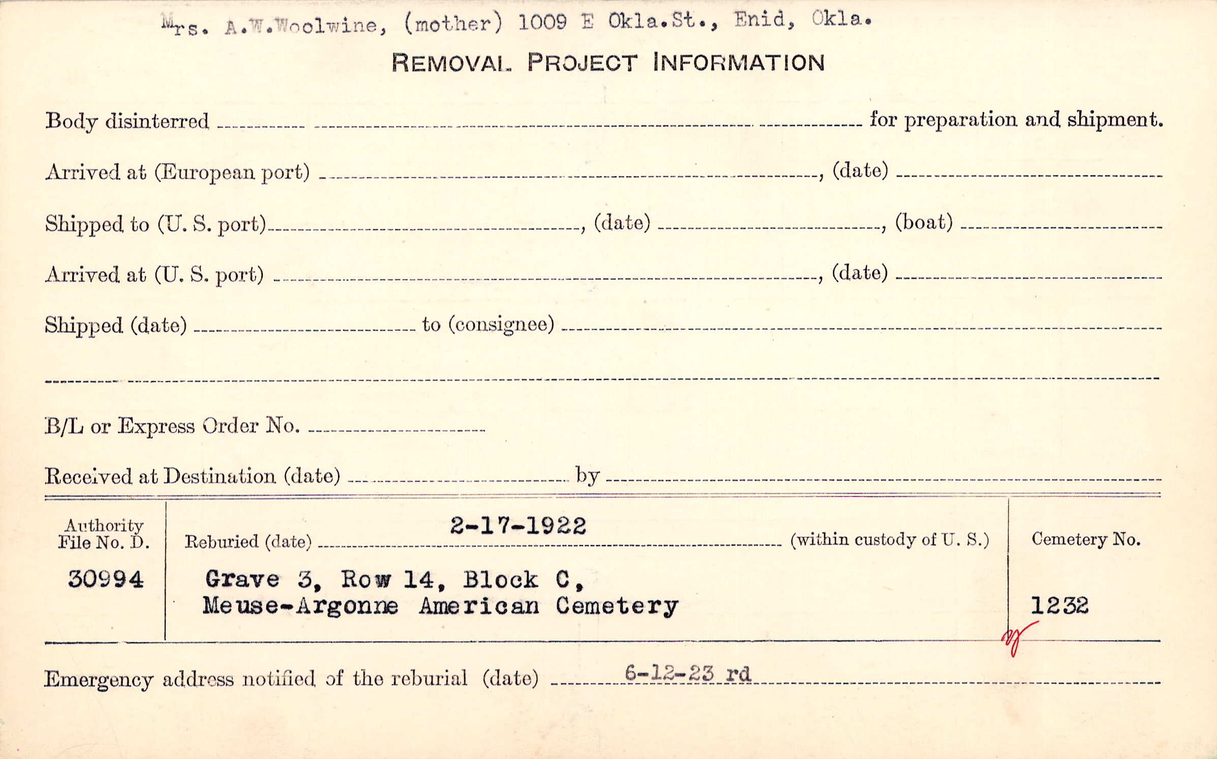 Mrs. A. W. Woolwine, (mother), 1009 E. Okla. St., Enid, Okla. |