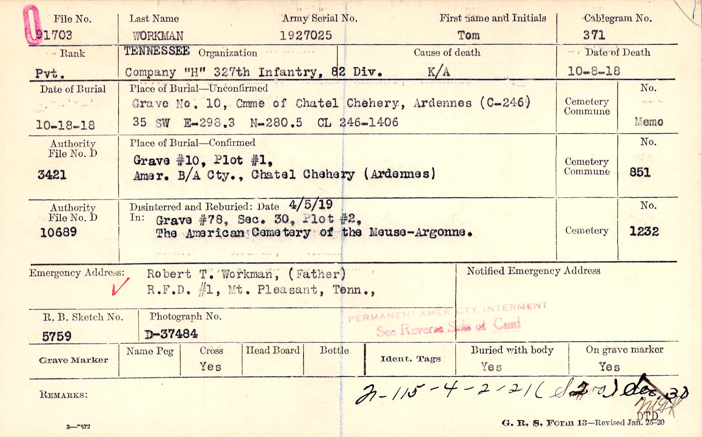Robert T. Workman, (Father), R.F.D. #1, Mt. Pleasant, Tenn.,