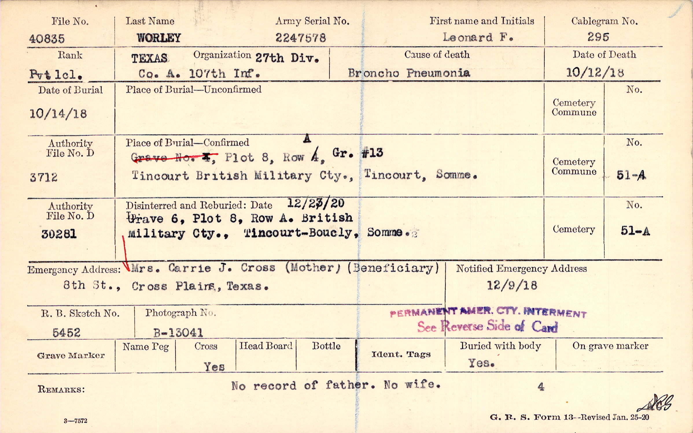 Mrs. Carrie J. Cross (Mother), 8th St., Cross Plains, Texas., (Beneficiary)