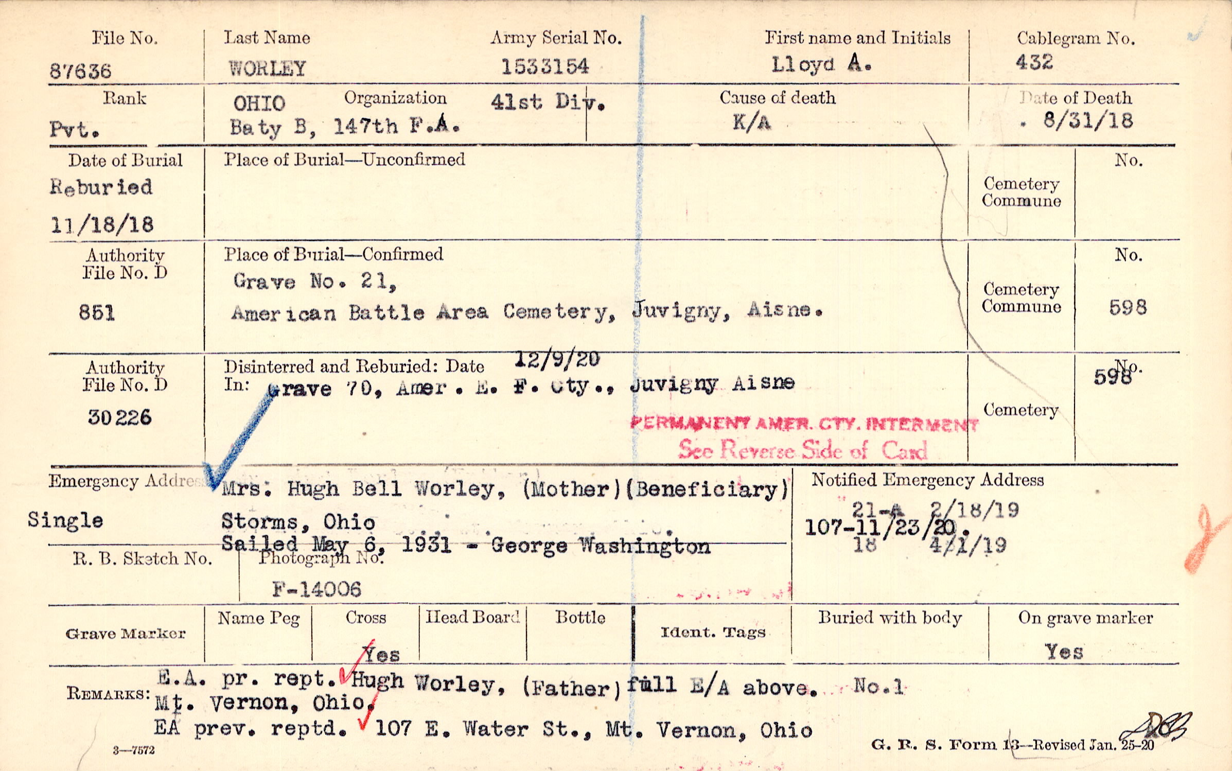 E.A. pr. rept. Hugh Worley, (Father) full E/A above., Mt. Vernon, Ohio. EA prev. reptd. 107 E. Water St., Mt. Vernon, Ohio