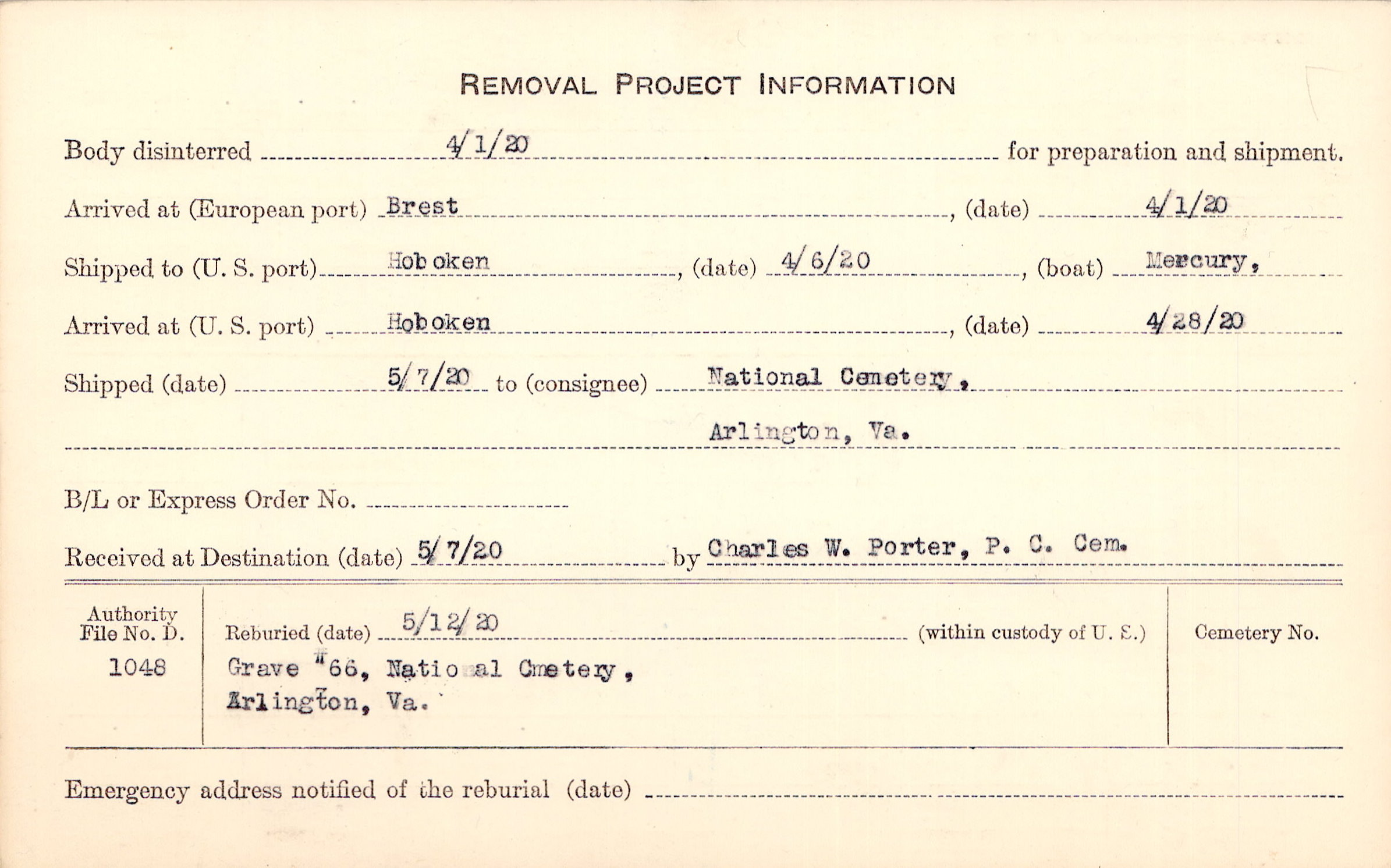 Body disinterred 4/1/1920 for preparation and shipment.