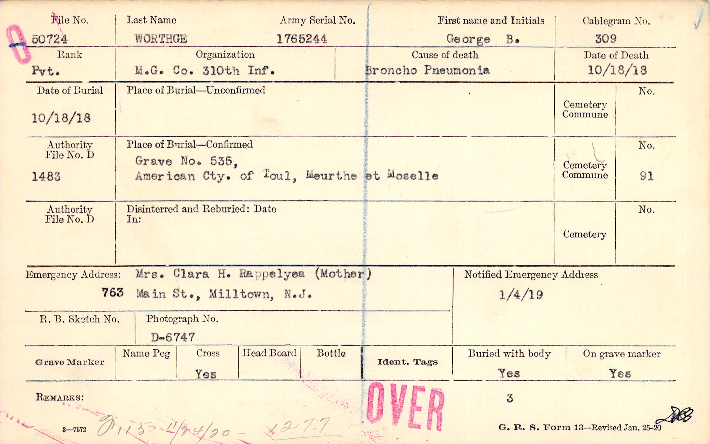 Mrs. Clara H. Rappelyea (Mother), 763 Main St., Milltown, N.J.