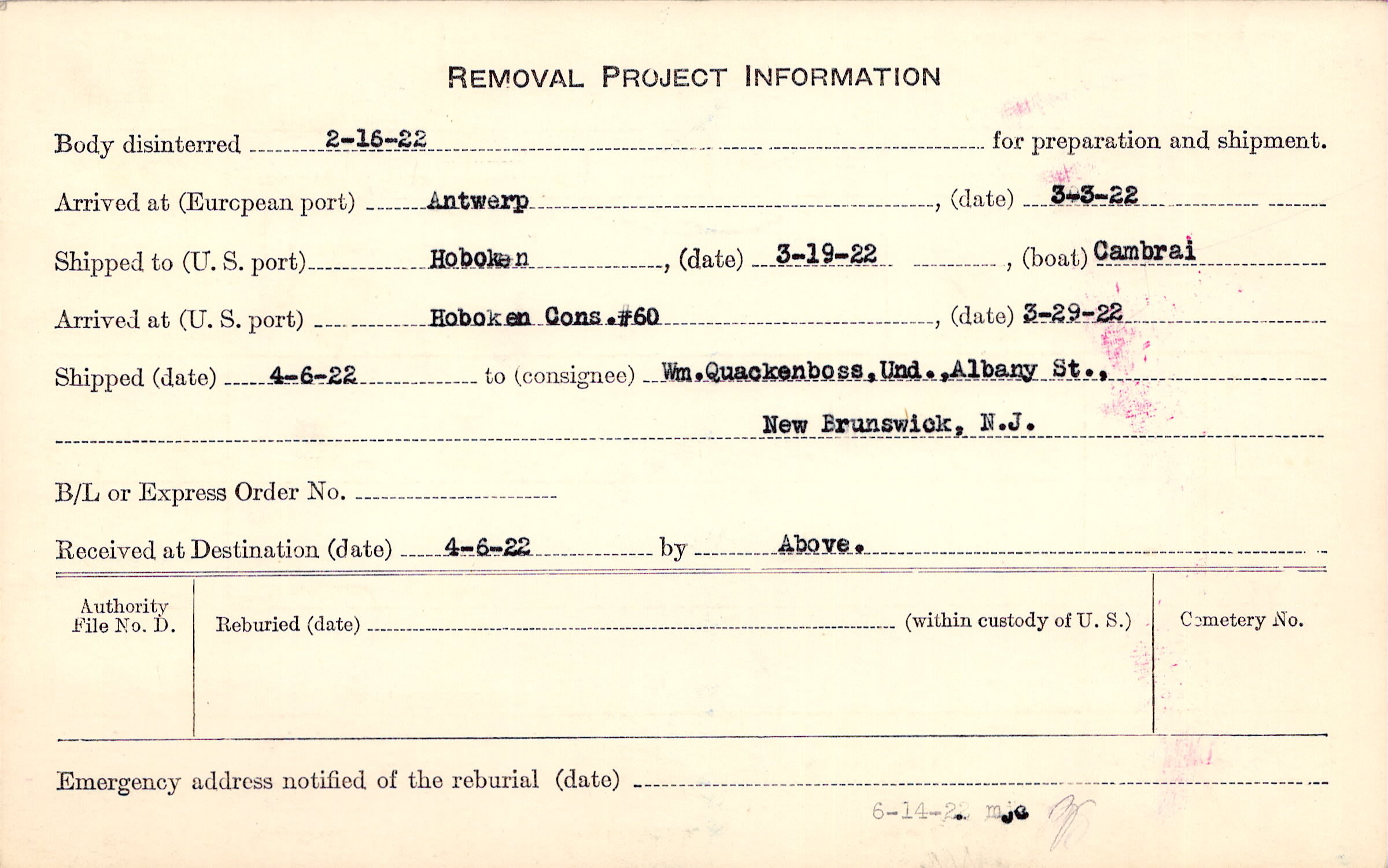 Body disinterred 2/16/1922 for preparation and shipment.
