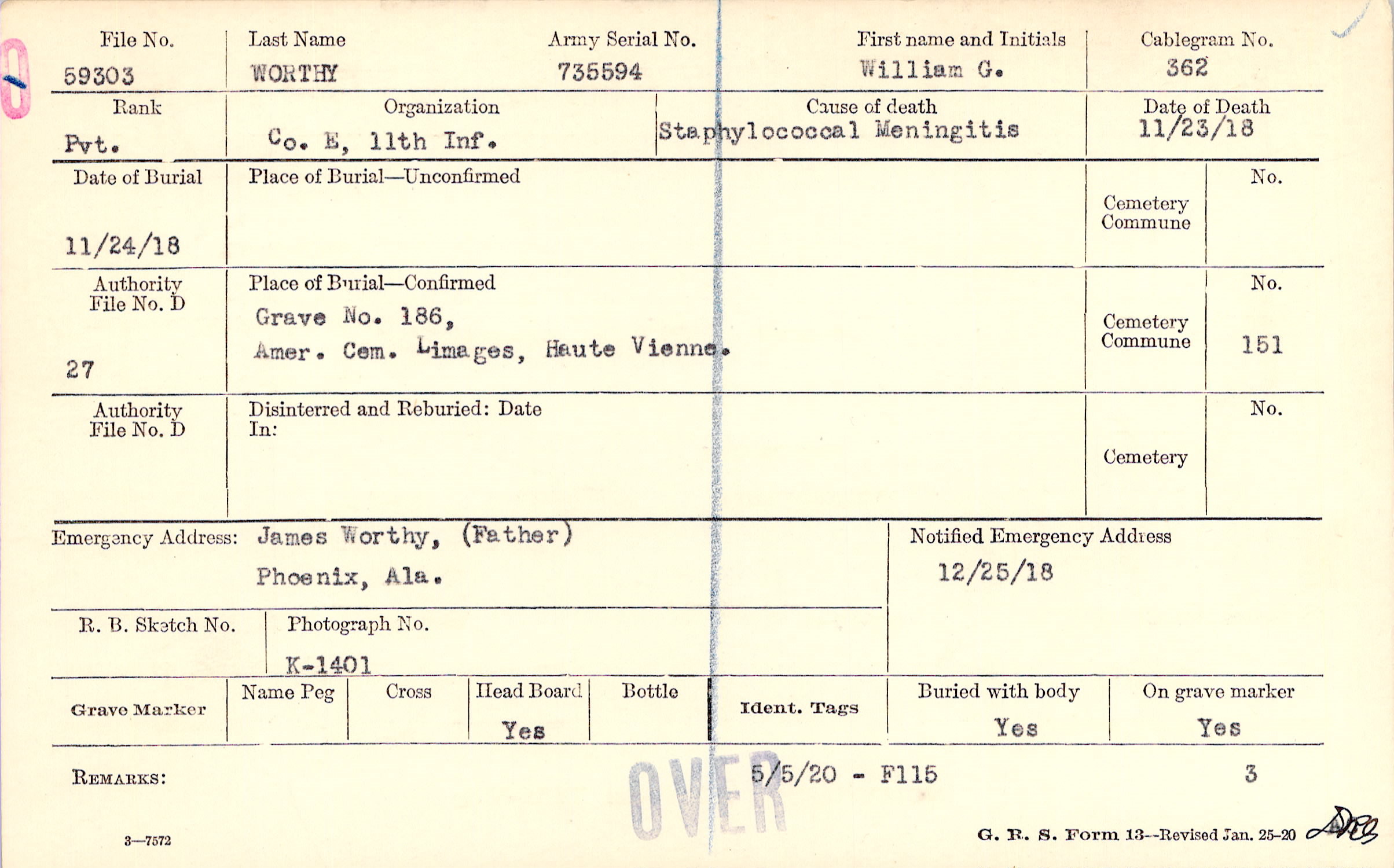 Grave 186, Amer. Cem. Limages, Haute, Vienne.