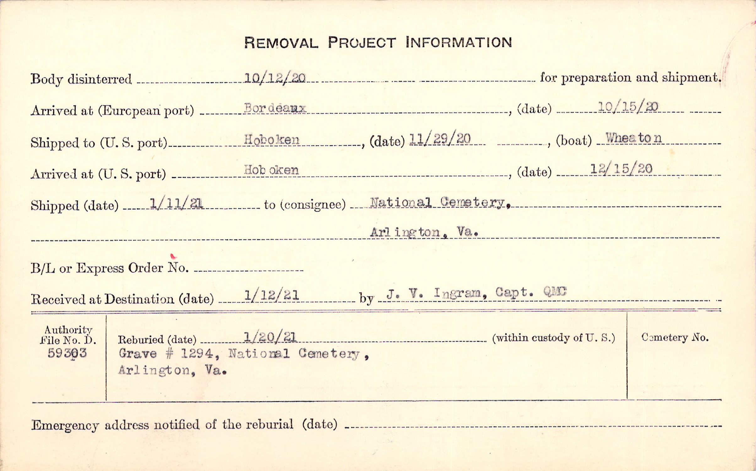 Body disinterred 10/12/1920 for preparation and shipment.