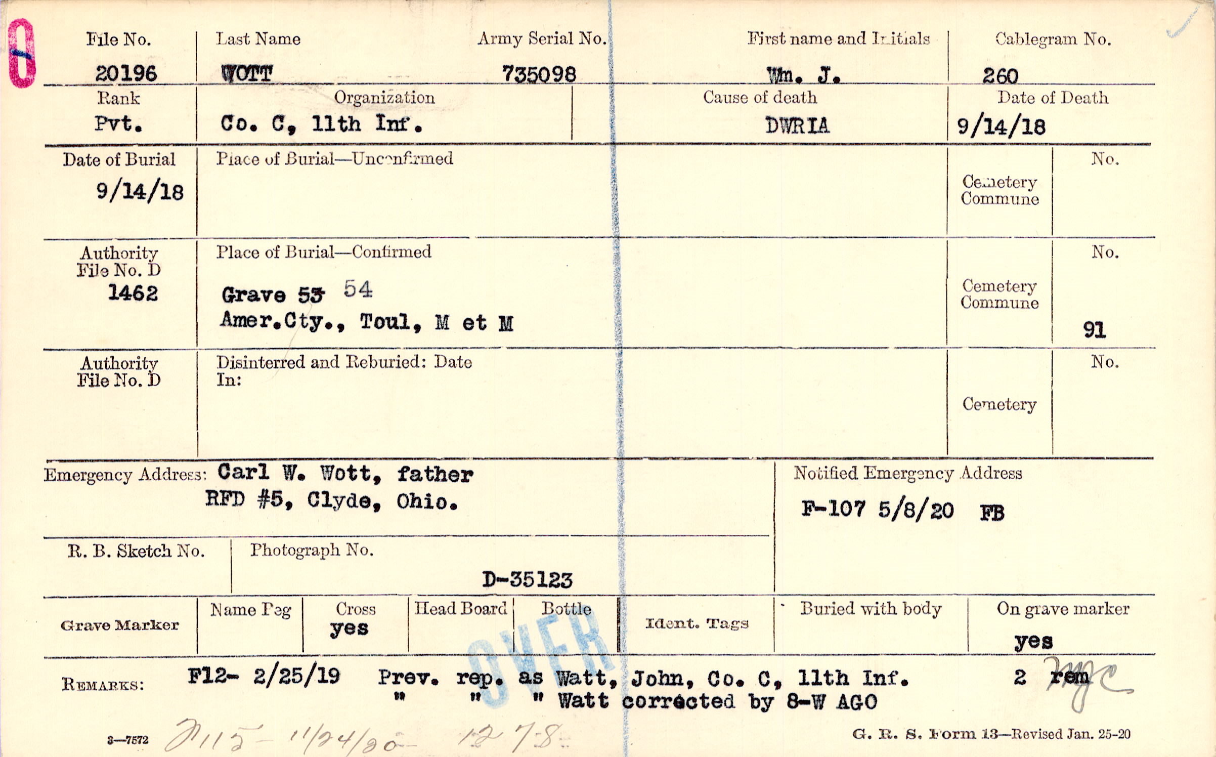 Carl W. Wott, father, RFD #5, Clyde, Ohio., F12- 2/25/19 Prev. rep as Watt, John. Co.C, 11th Inf. 2rem Prev. rep. as Watt corrected by 8-W AGO F115 11/24/20 1278