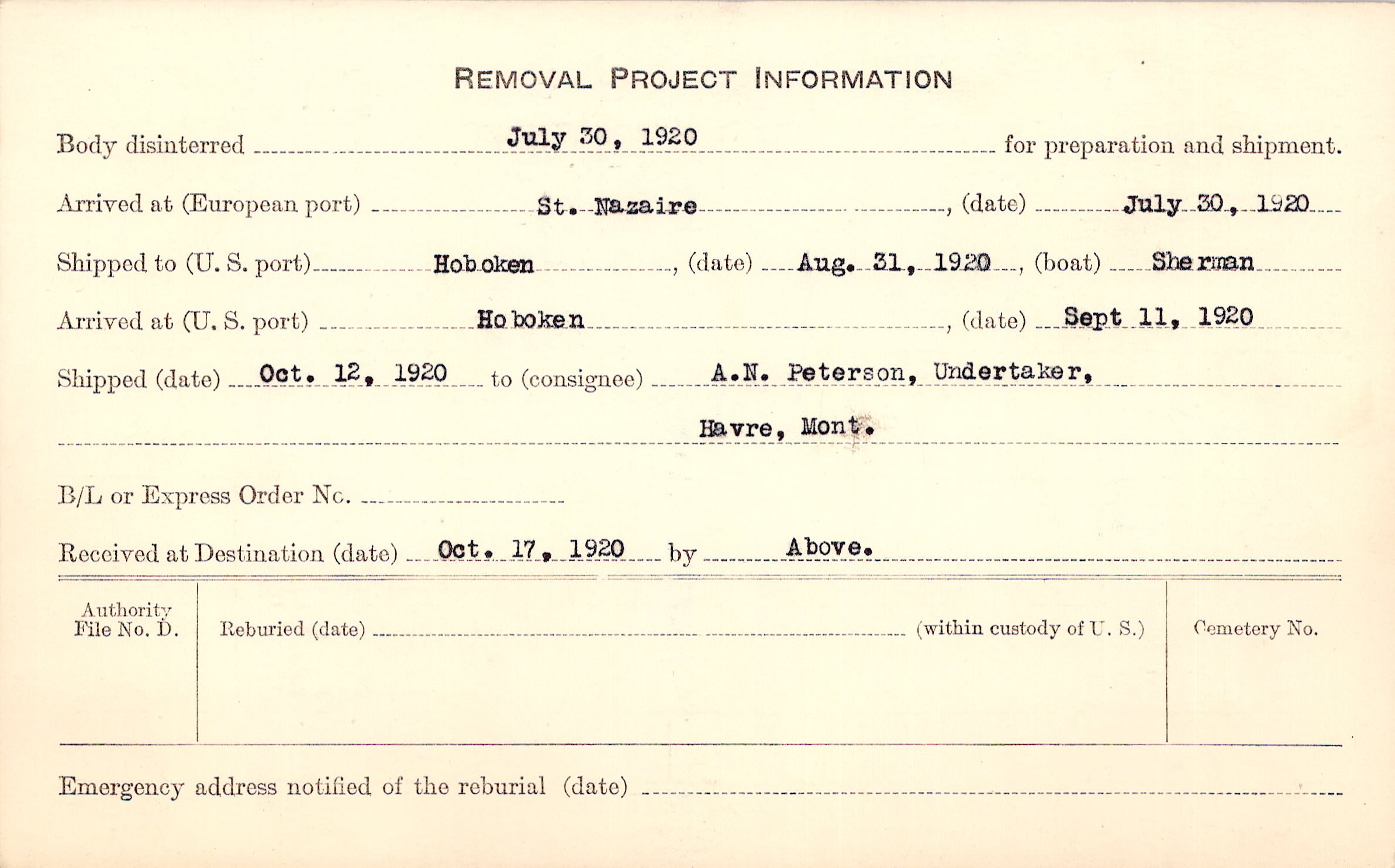 to A.N. Peterson, Undertaker, Havre, Mont.