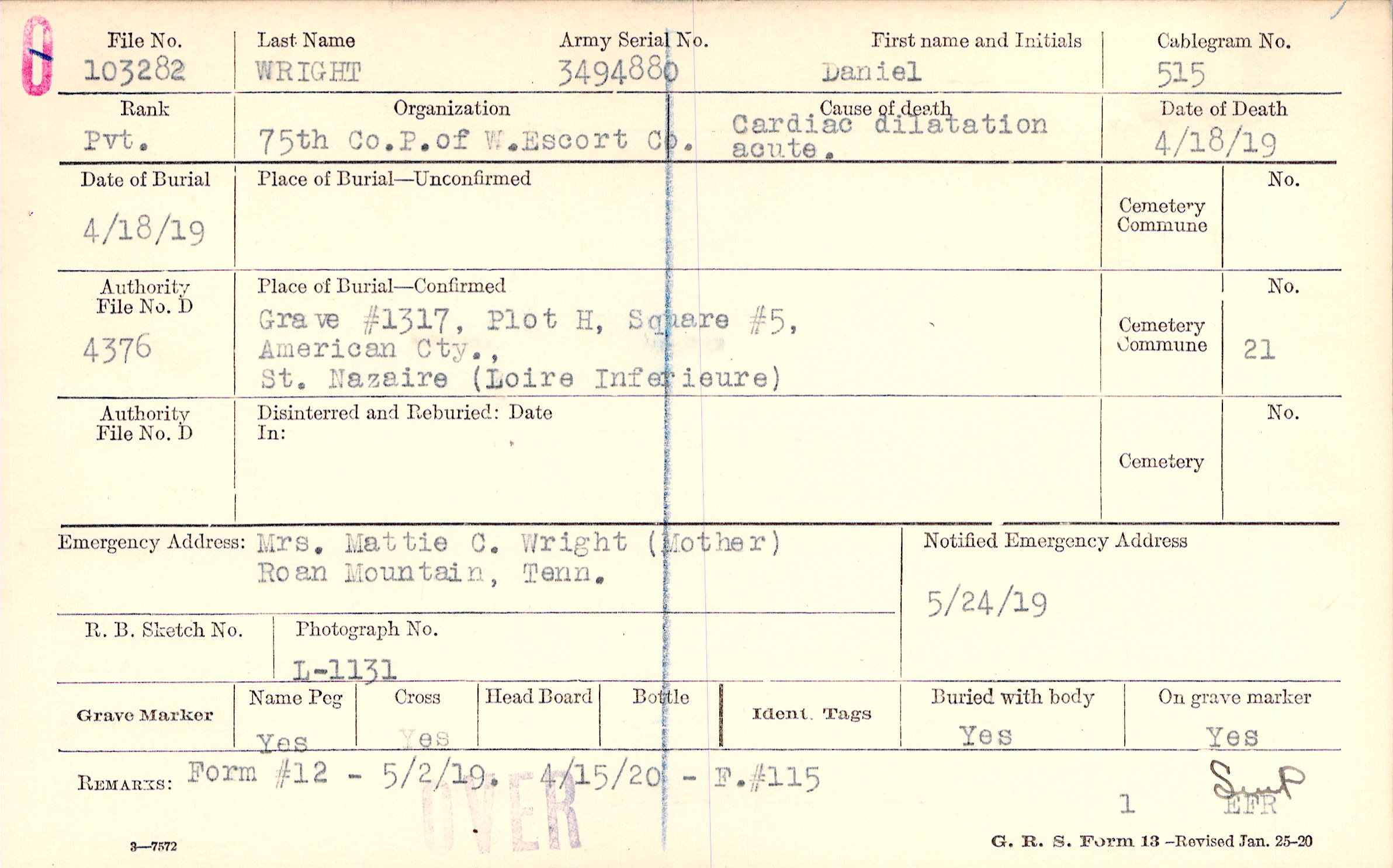 Grave #1317, Plot H, Square #5, American Cty., St. Nazaire, Loire Inferieure