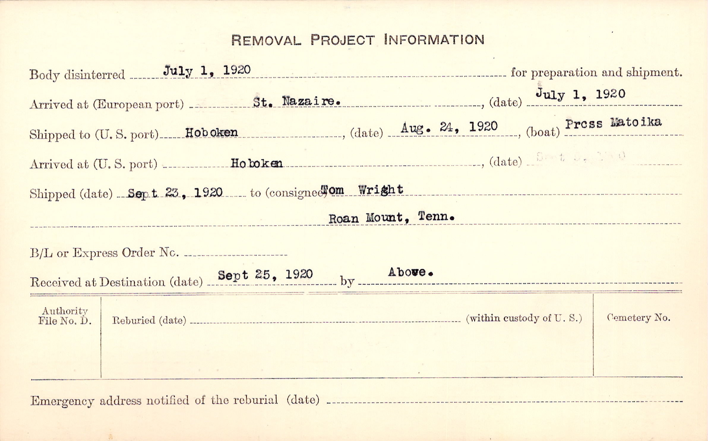 Body disinterred 7/1/1920 for preparation and shipment.