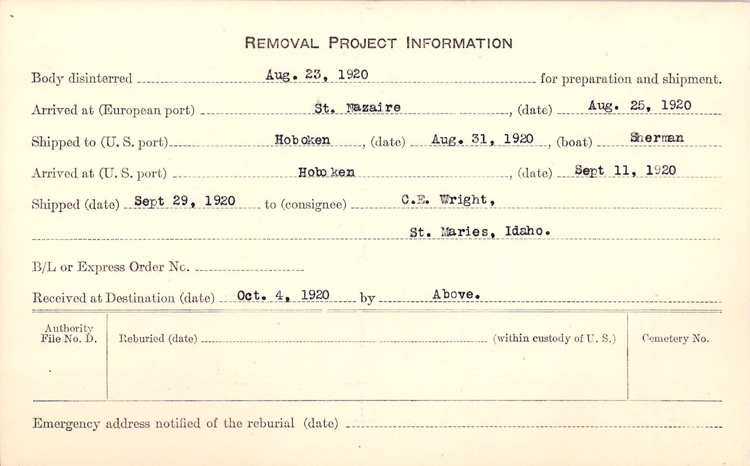 Body disinterred 8/23/1920 for preparation and shipment.