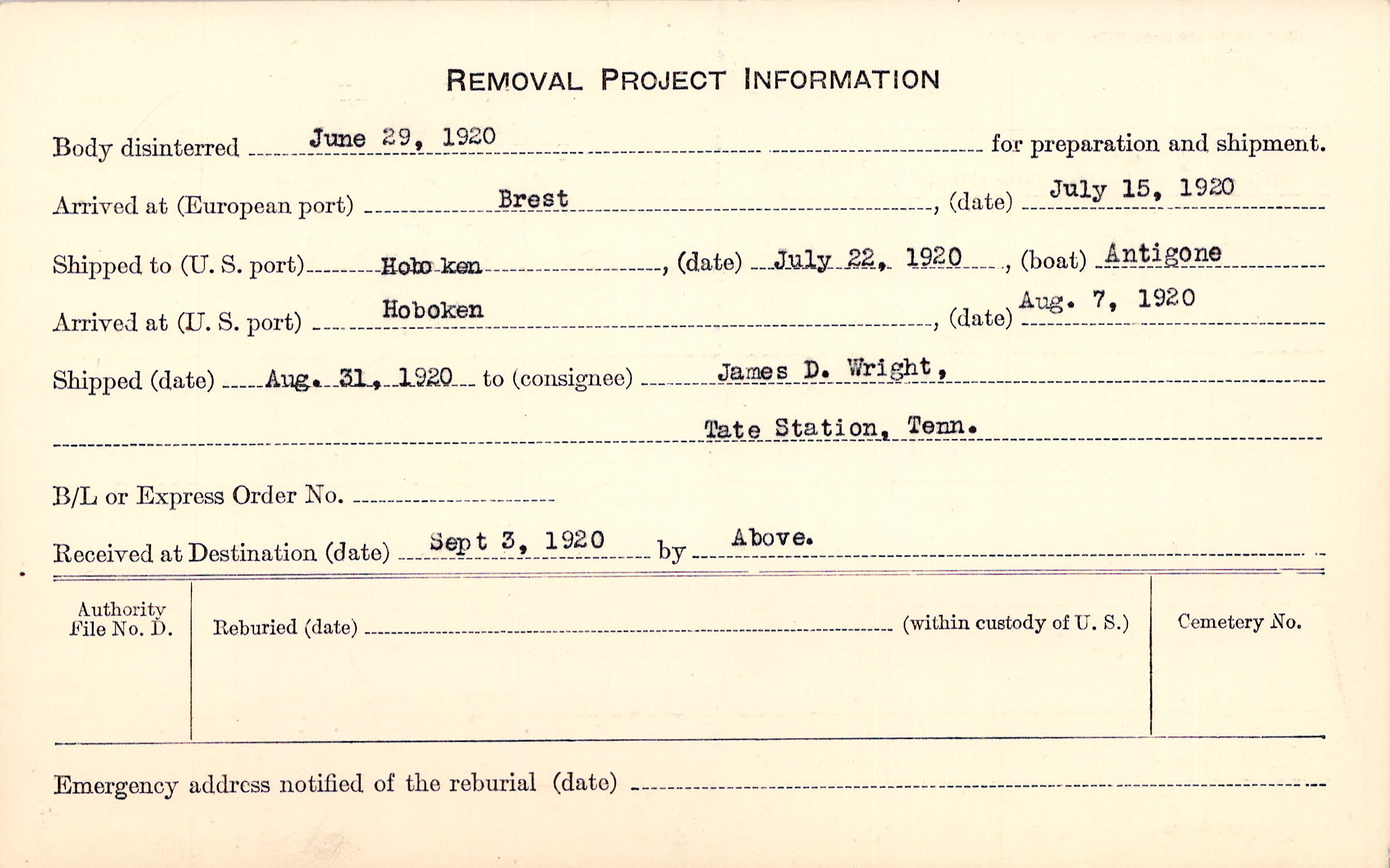 Body disinterred 6/29/1920 for preparation and shipment.