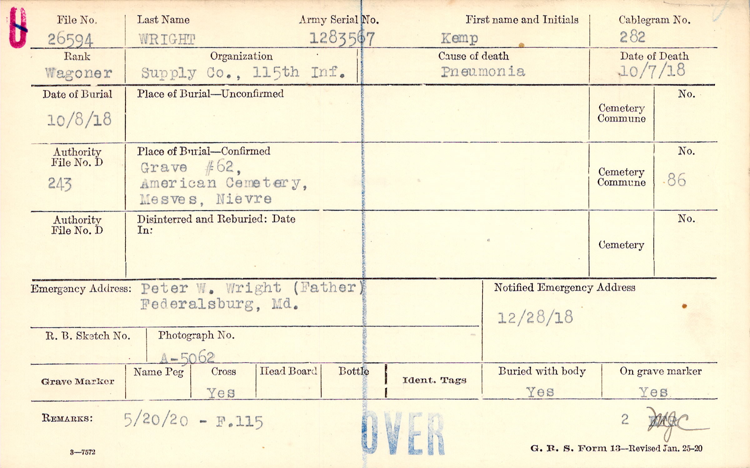 Grave #62, American Cemetery, Mesves, Nievre