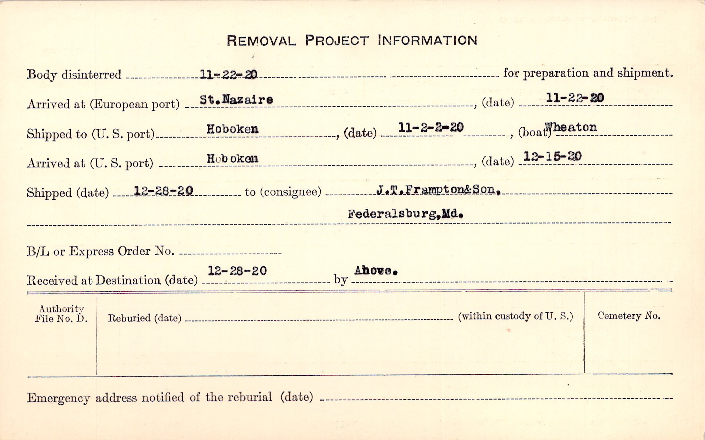 Body disinterred 11/22/1920 for preparation and shipment.