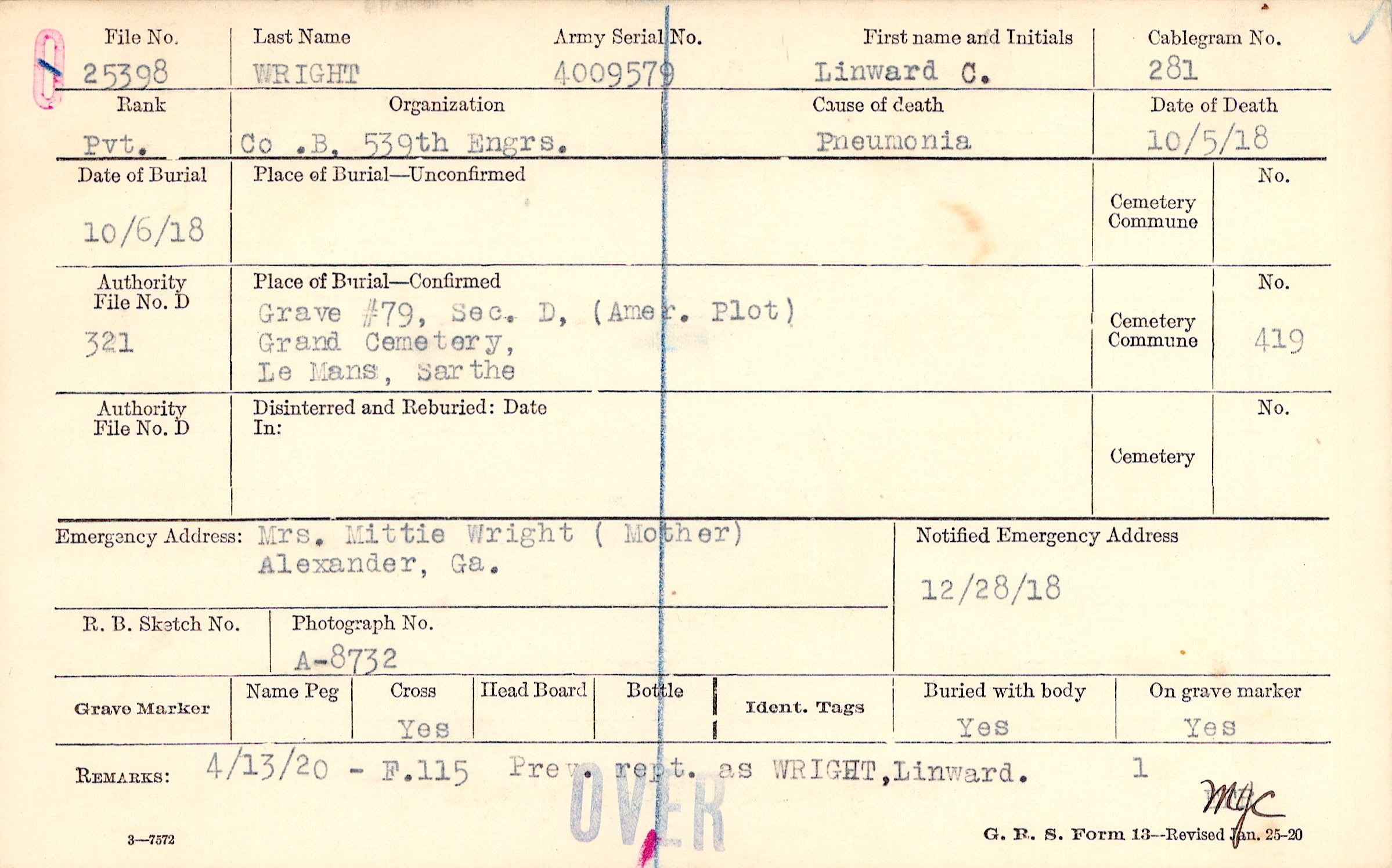 Grave #79, Sec. D, (Amer. Plot), Grand Cemetery, Le Mans, Sarthe