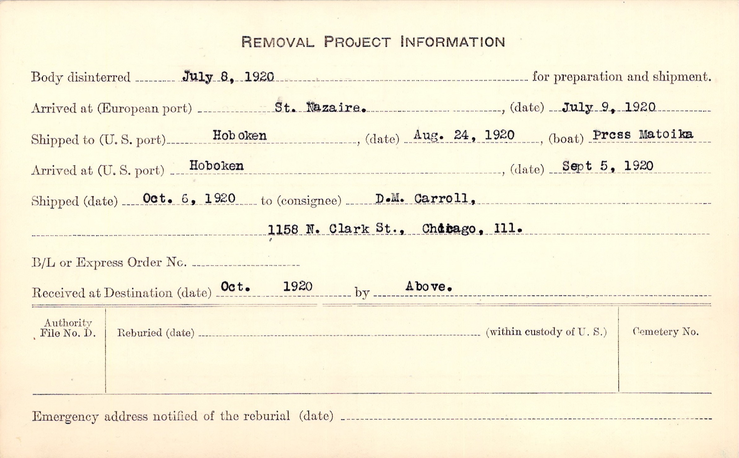Body disinterred 7/8/1920 for preparation and shipment.