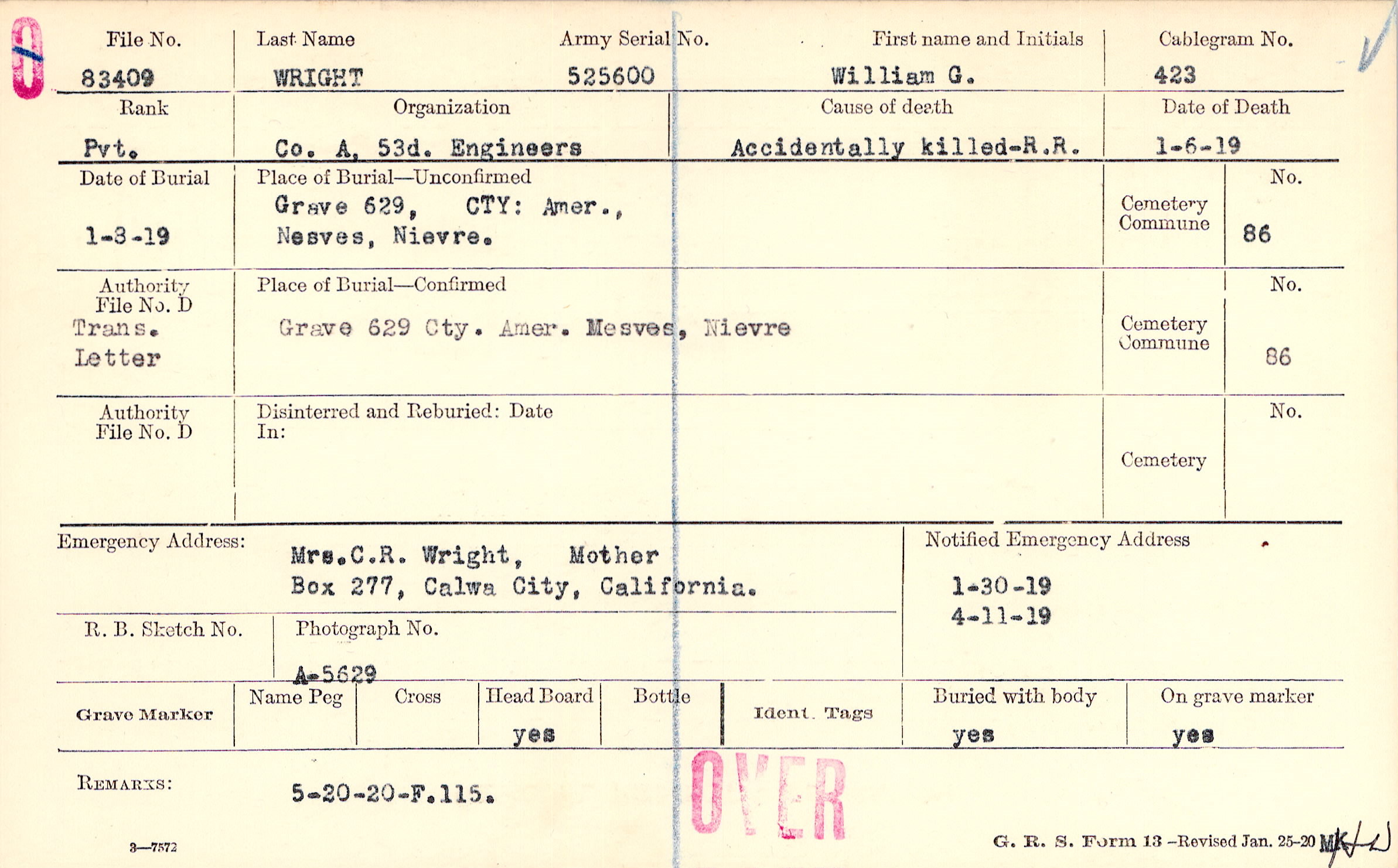Grave 629, Cty. Amer., Mesves, Nievre.