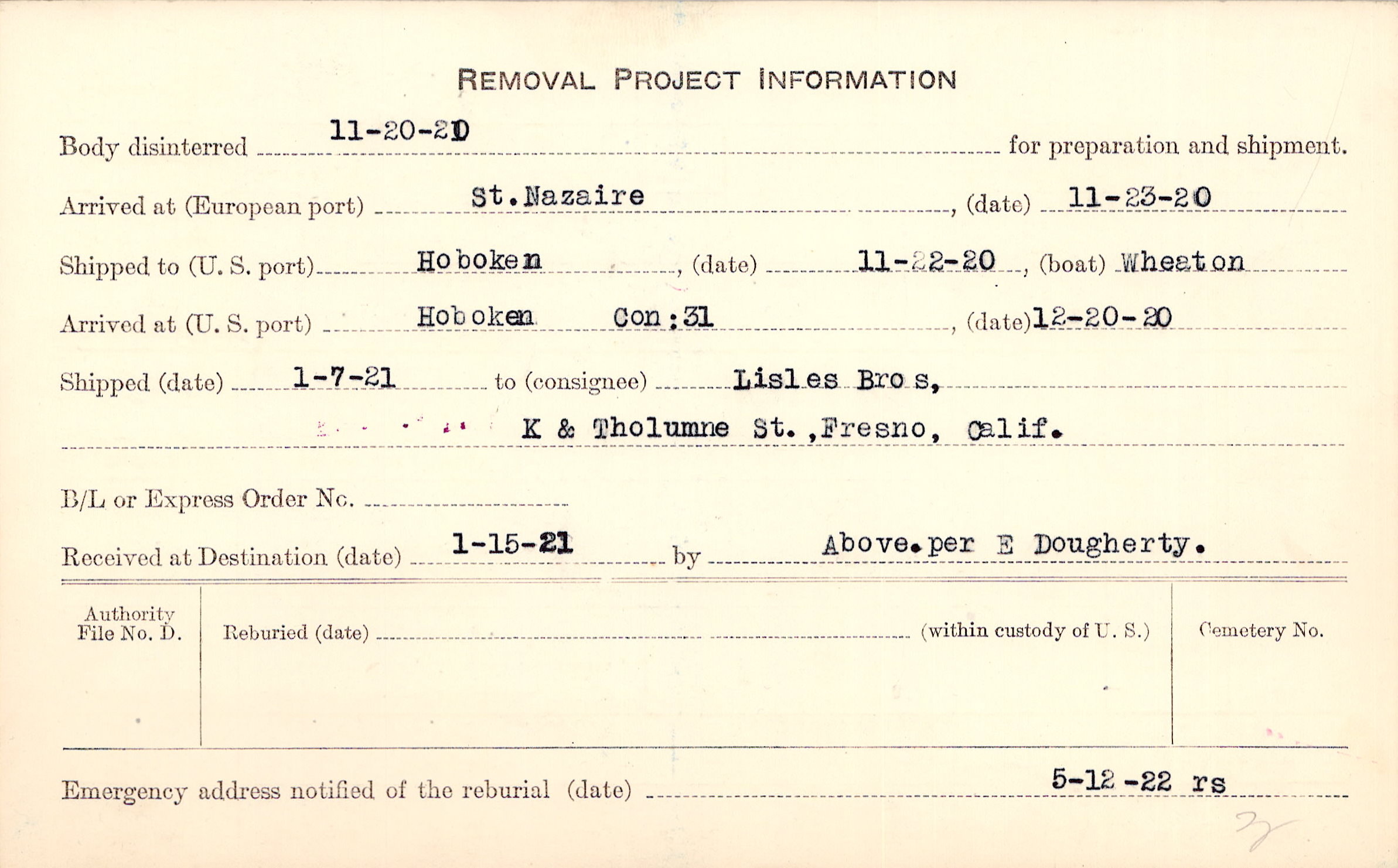 Body disinterred 11/20/1920 for preparation and shipment.