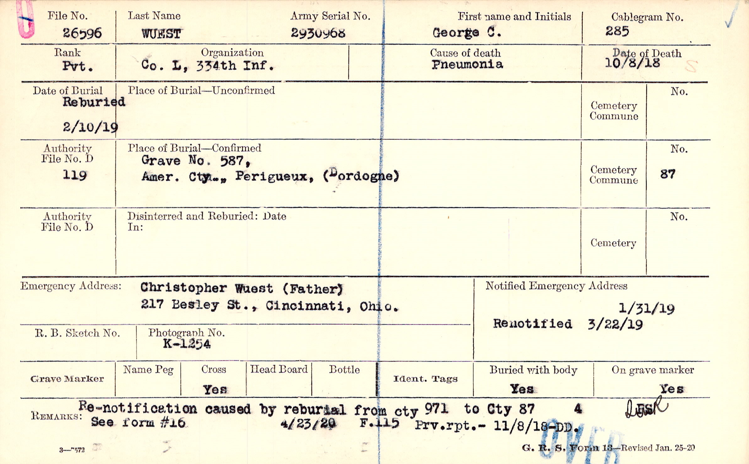 Christopher Wuest (Father), 217 Besley St., Cincinnati, Ohio.