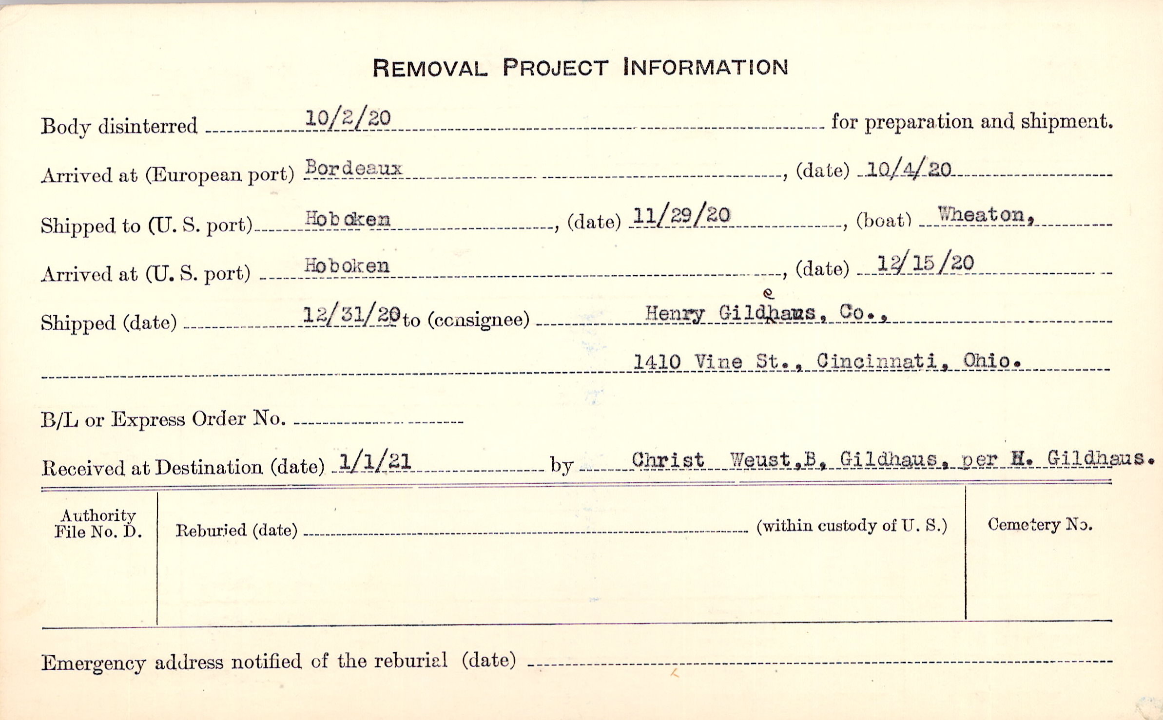 Body disinterred 10/2/1920 for preparation and shipment.