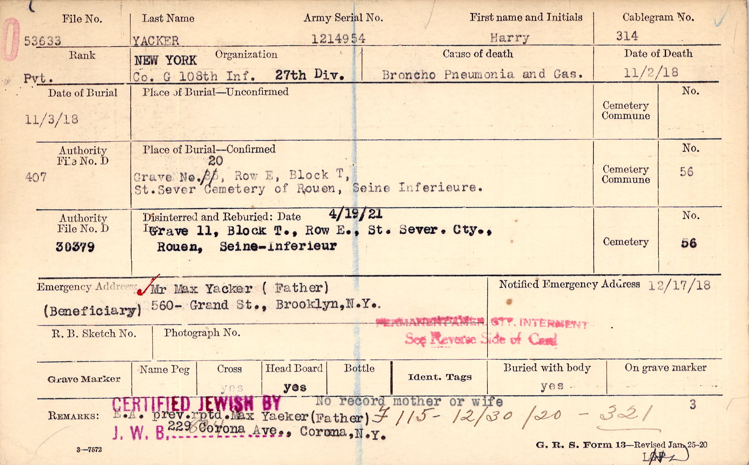 Mr Max Yacker (Father), 560- Grand St., Brooklyn, N.Y., (Beneficiary)