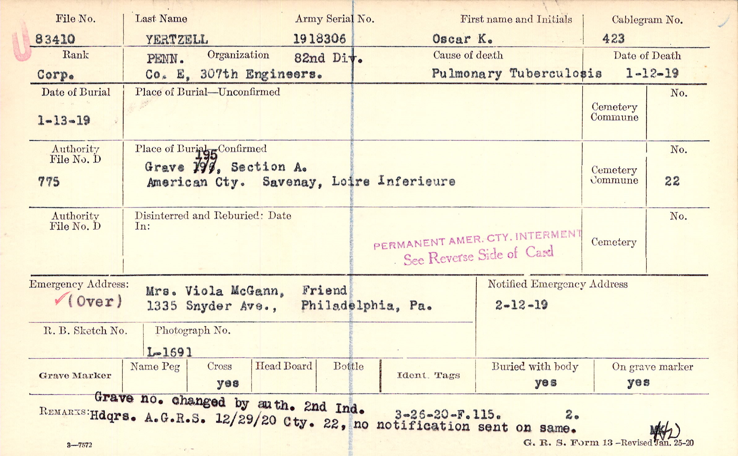 Grave no. changed by auth. 2nd Ind. Hdqrs. A.G.R.S. 12/29/20 Cty. 22, no notification sent on same., Grave no. changed by auth. 2nd Ind 3-26-20-F.115. Hdqrs. A.G.R.S. 12/29/20 cty. 22, no notification sent on same.