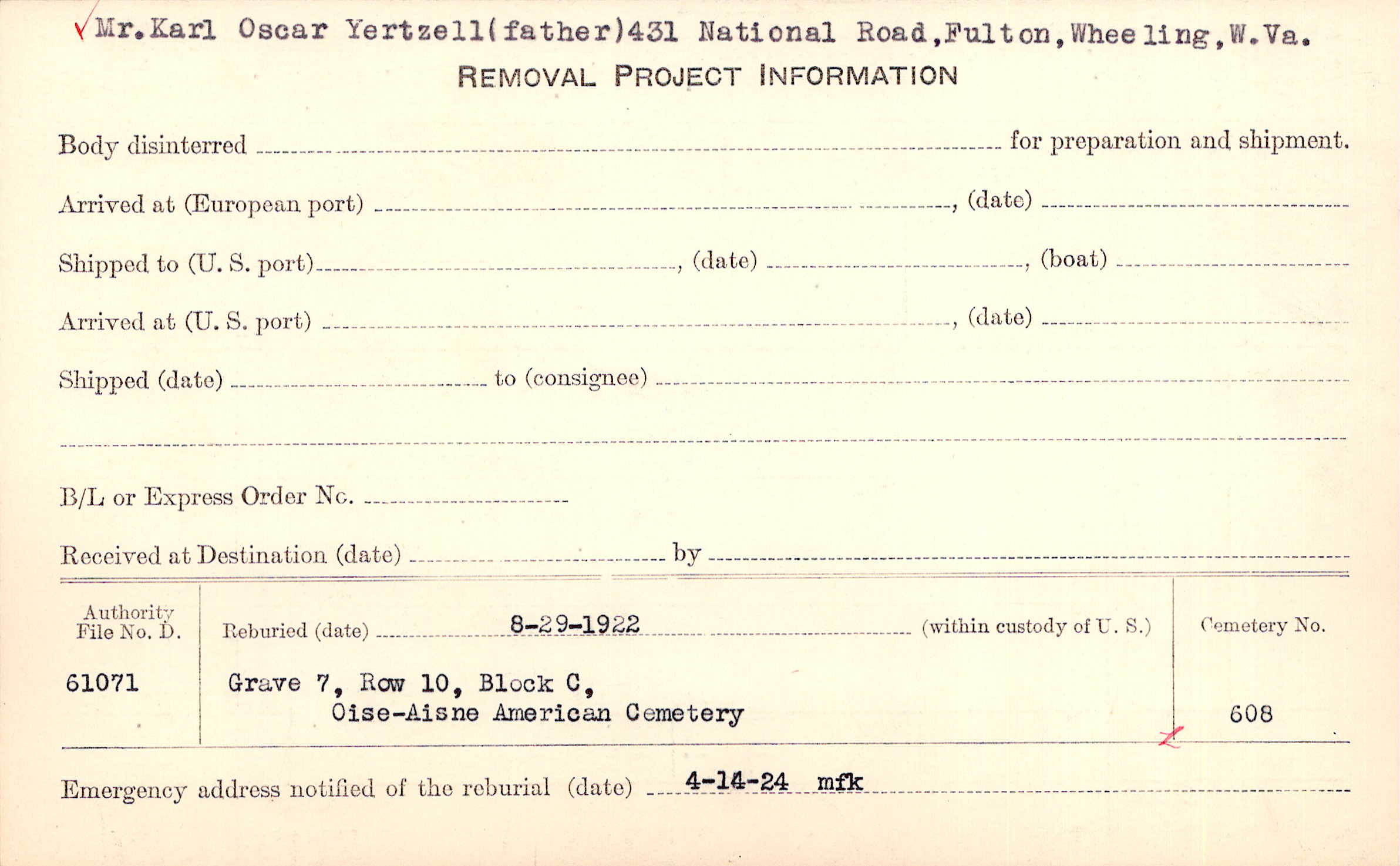 Mr. Karl Oscar Yertzell (father) 431 National Road, Fulton, Wheeling, W. Va. |