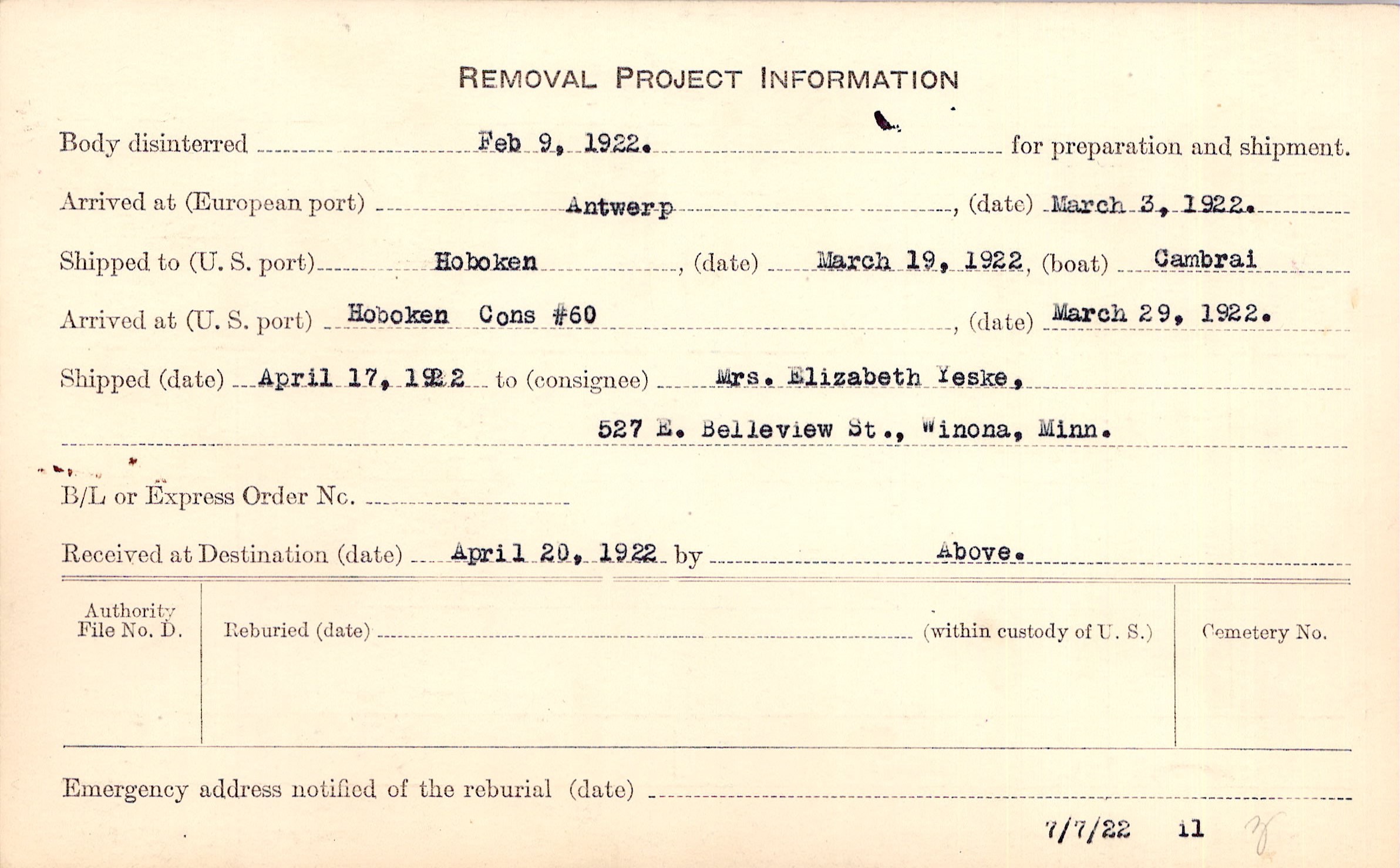 Mrs. Elizabeth Yeske, Mother, 527 E. Belivier St., Winona, Minn.