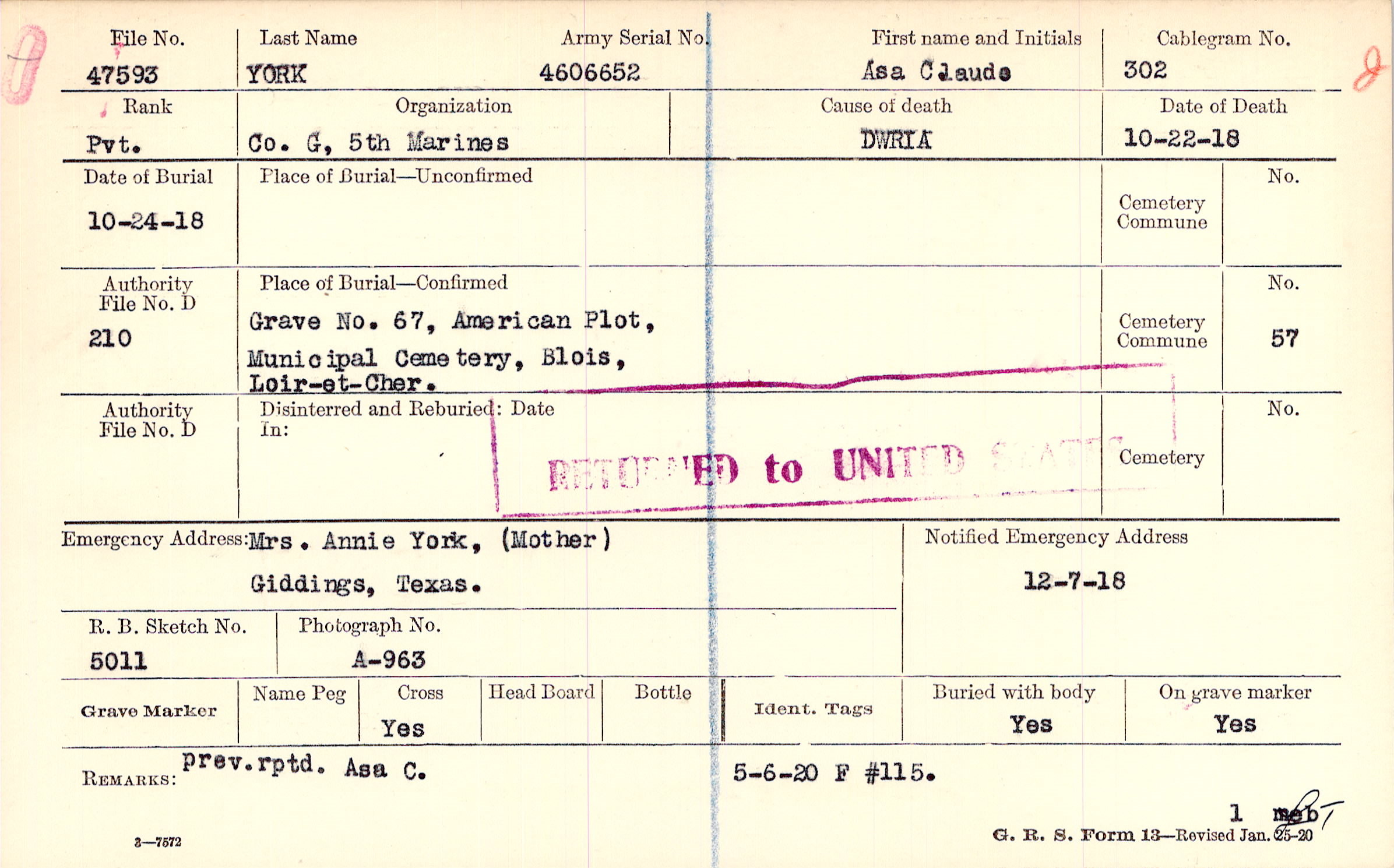 Grave 67, American Plot, Municipal Cemetery, Blois, Loir-et-Cher