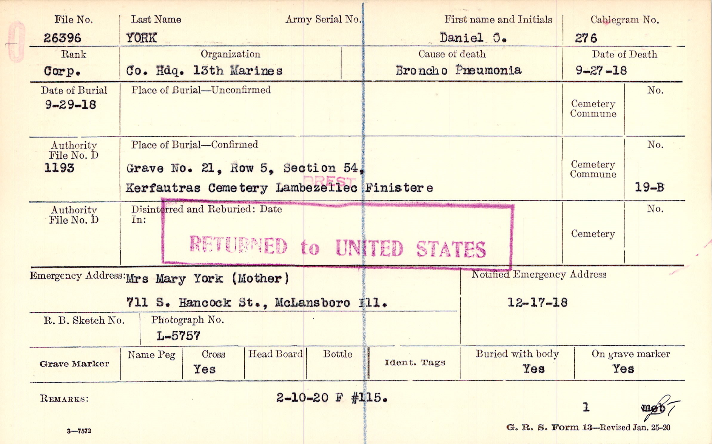 Mrs Mary York (Mother), 711 S. Hancock St., McLansboro Ill.