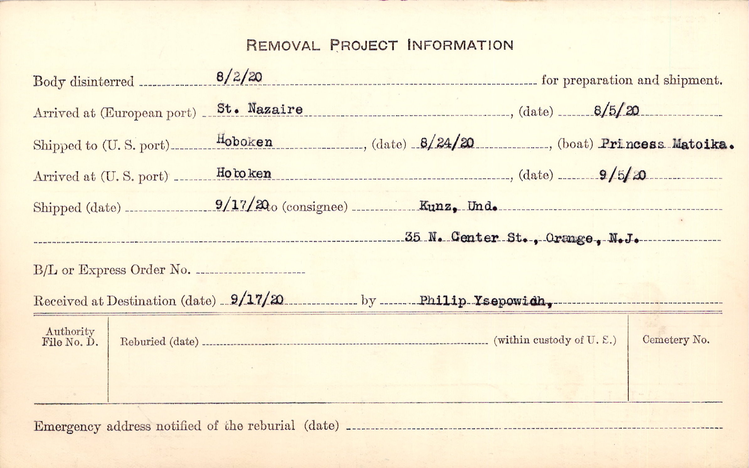 Body disinterred 8/2/1920 for preparation and shipment.