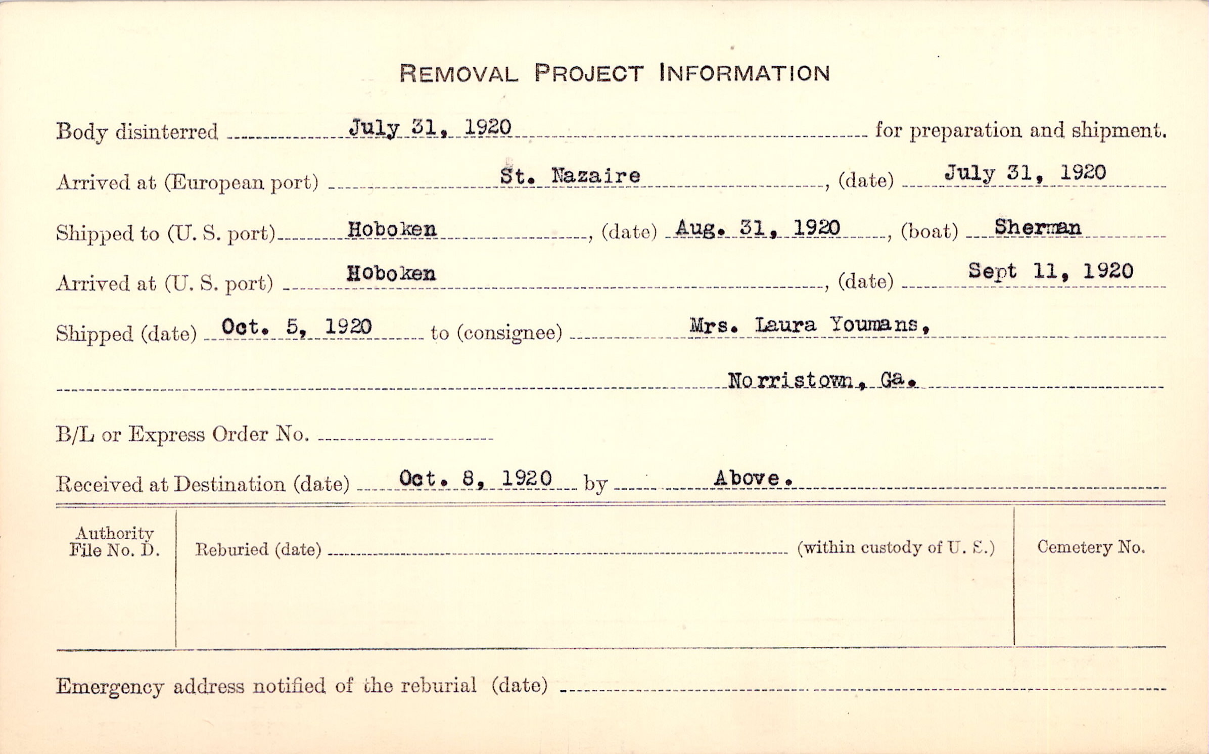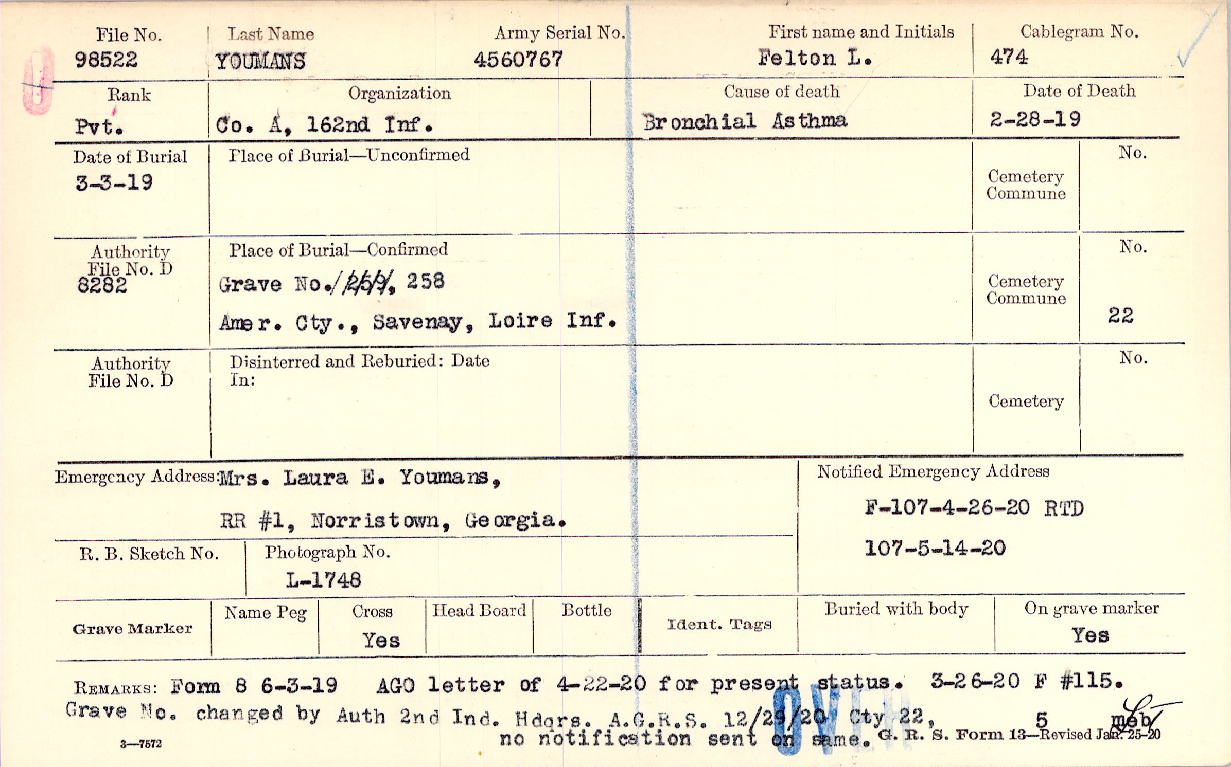 AGO Letter of 4-22-20 for present status. Grave No. changed by Auth 2nd Ind. Hdqrs. A.G.R.S. 12/29/20 Cty 22, no notification sent on same., Form 8 6-3-19, 3-26-20 F #115