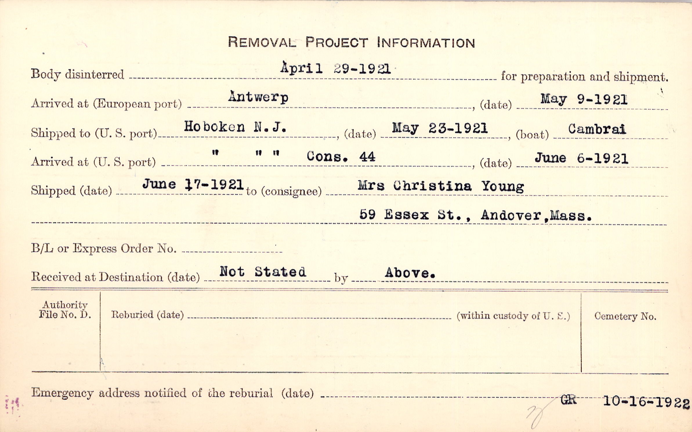Body disinterred 4/29/1921 for preparation and shipment.