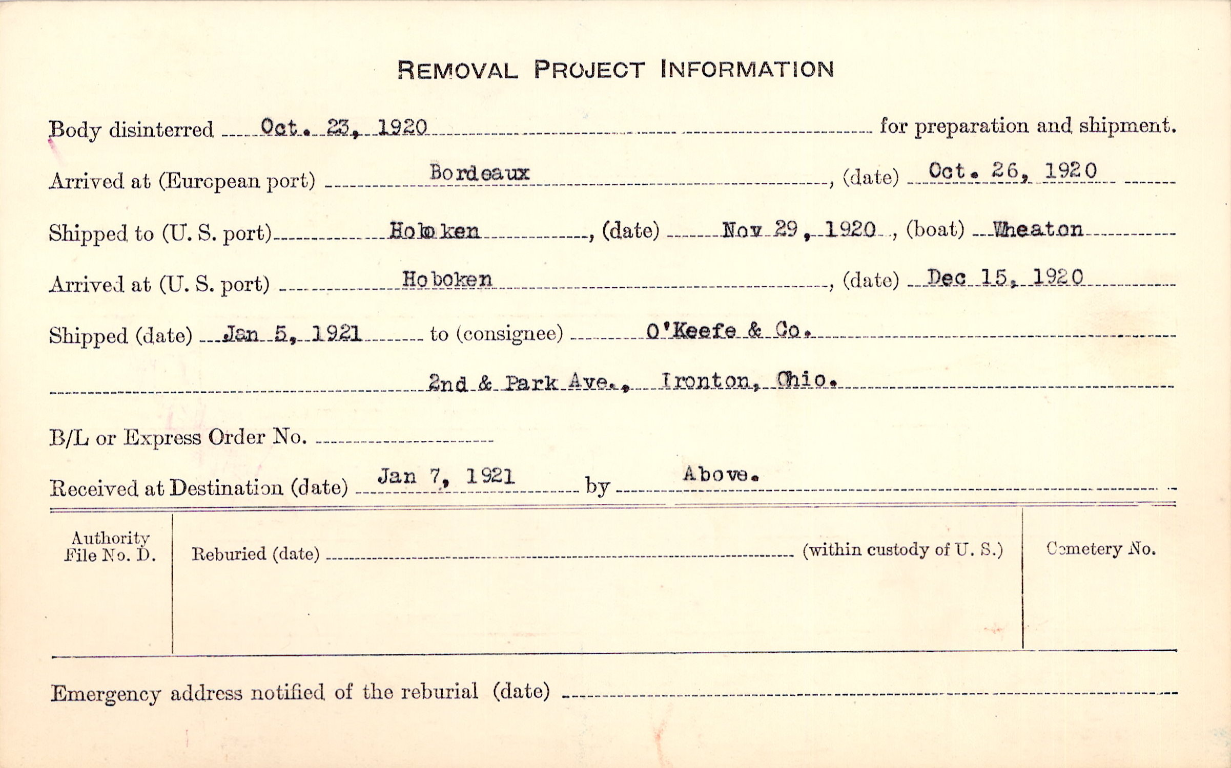 Body disinterred 10/23/1920 for preparation and shipment.