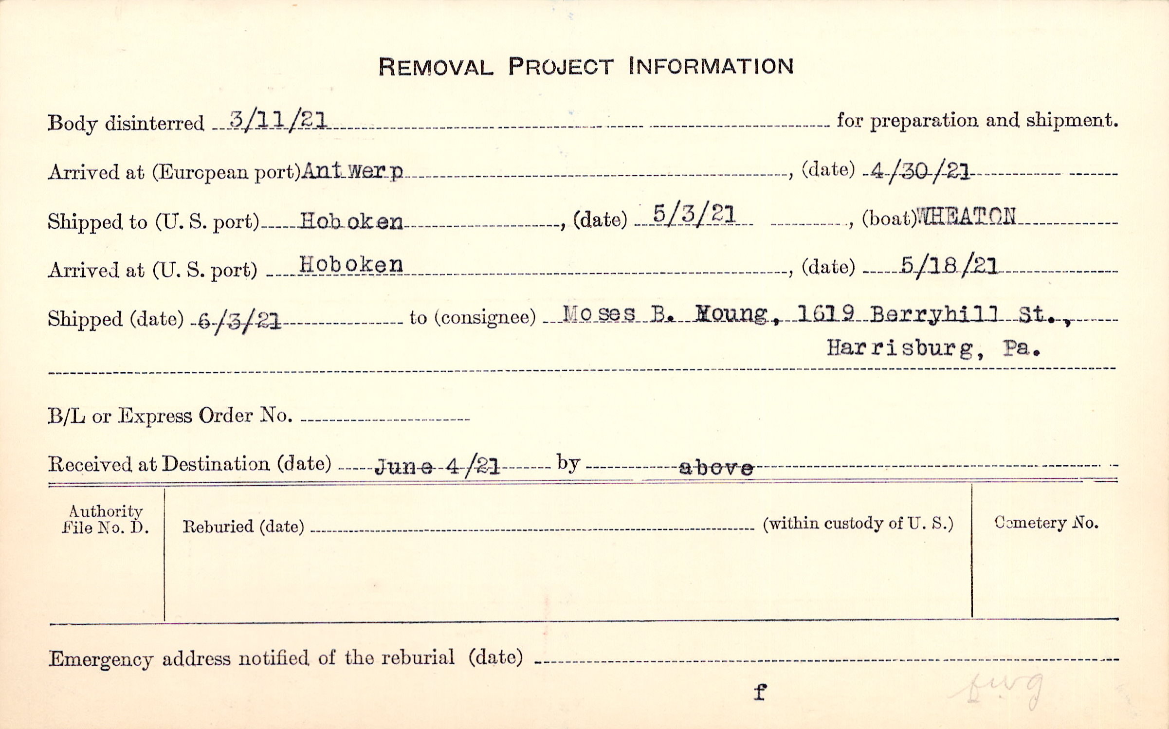 Body disinterred 3/11/1921 for preparation and shipment.