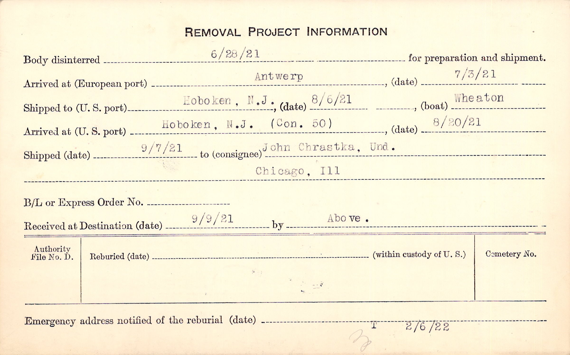 Body disinterred 6/28/1921 for preparation and shipment.
